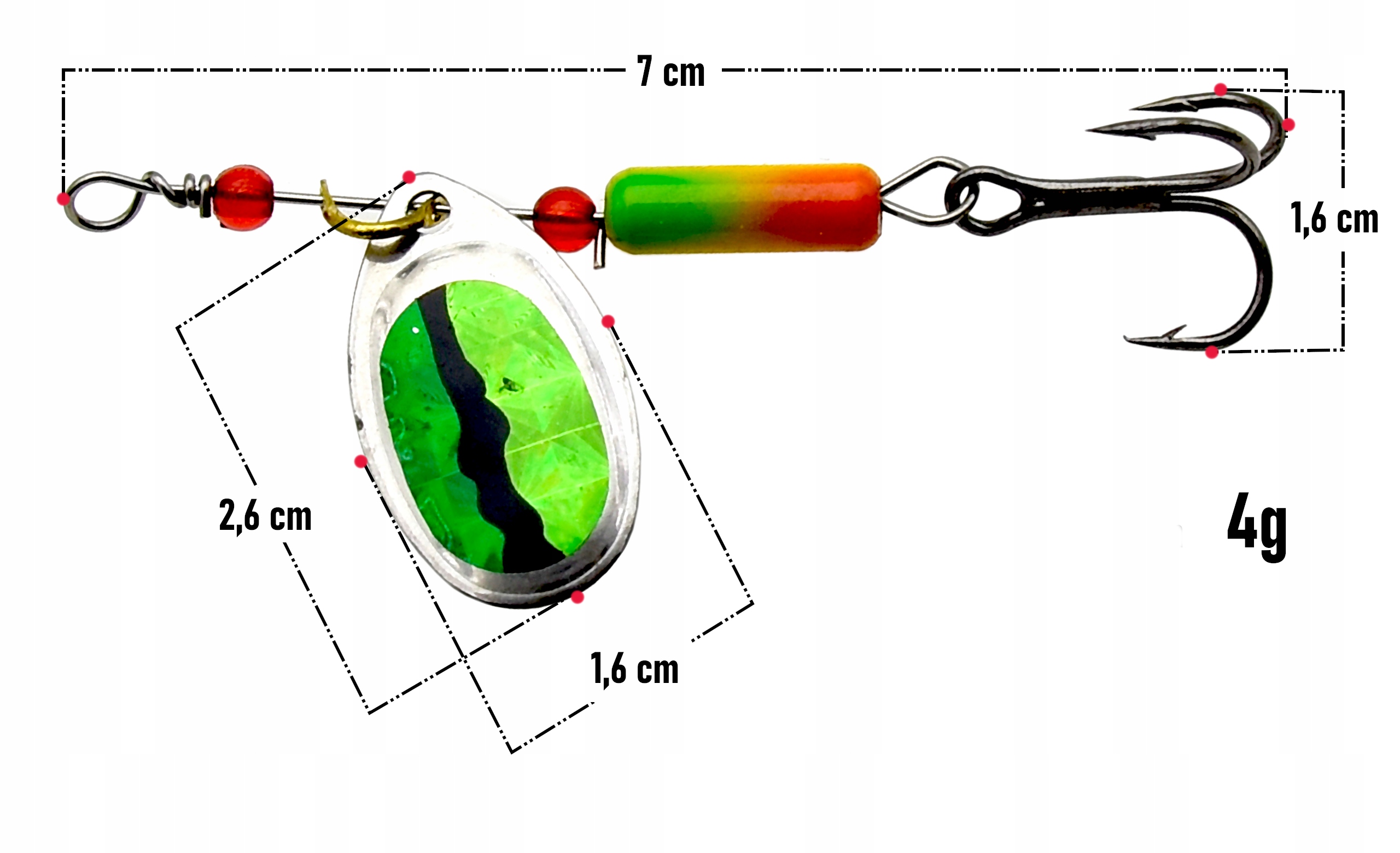 Błystka obrotowa o wadze 4 gramów to niezawodna przynęta, która sprawdzi się w każdych warunkach – zarówno w wodach stojących, jak i w rzekach o umiarkowanym nurcie. Dzięki odpowiedniemu wyważeniu i płynnej pracy skrzydełka skutecznie przyciąga uwagę drapieżników, pobudzając ich instynkt do ataku.
