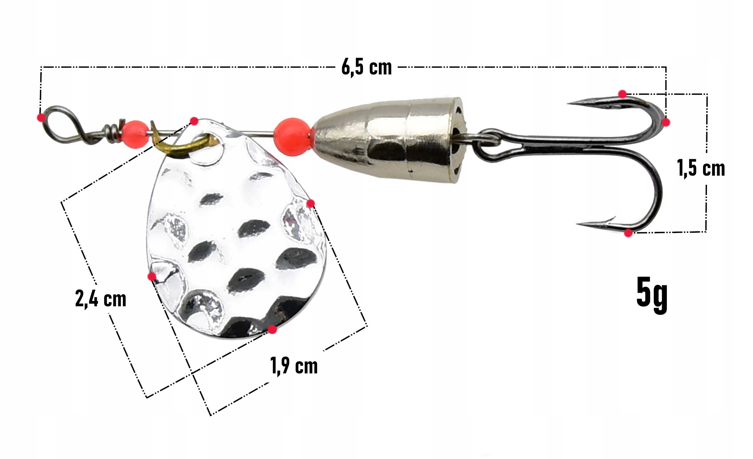 Solidna konstrukcja oparta na metalowym trzpieniu gwarantuje trwałość i odporność na odkształcenia. Na osi umieszczone są koraliki stabilizujące pracę skrzydełka, które pomagają utrzymać jego równomierne obroty podczas prowadzenia przynęty. Całość uzupełnia ostrze potrójnego haka zapewniające pewne i skuteczne zacięcie.