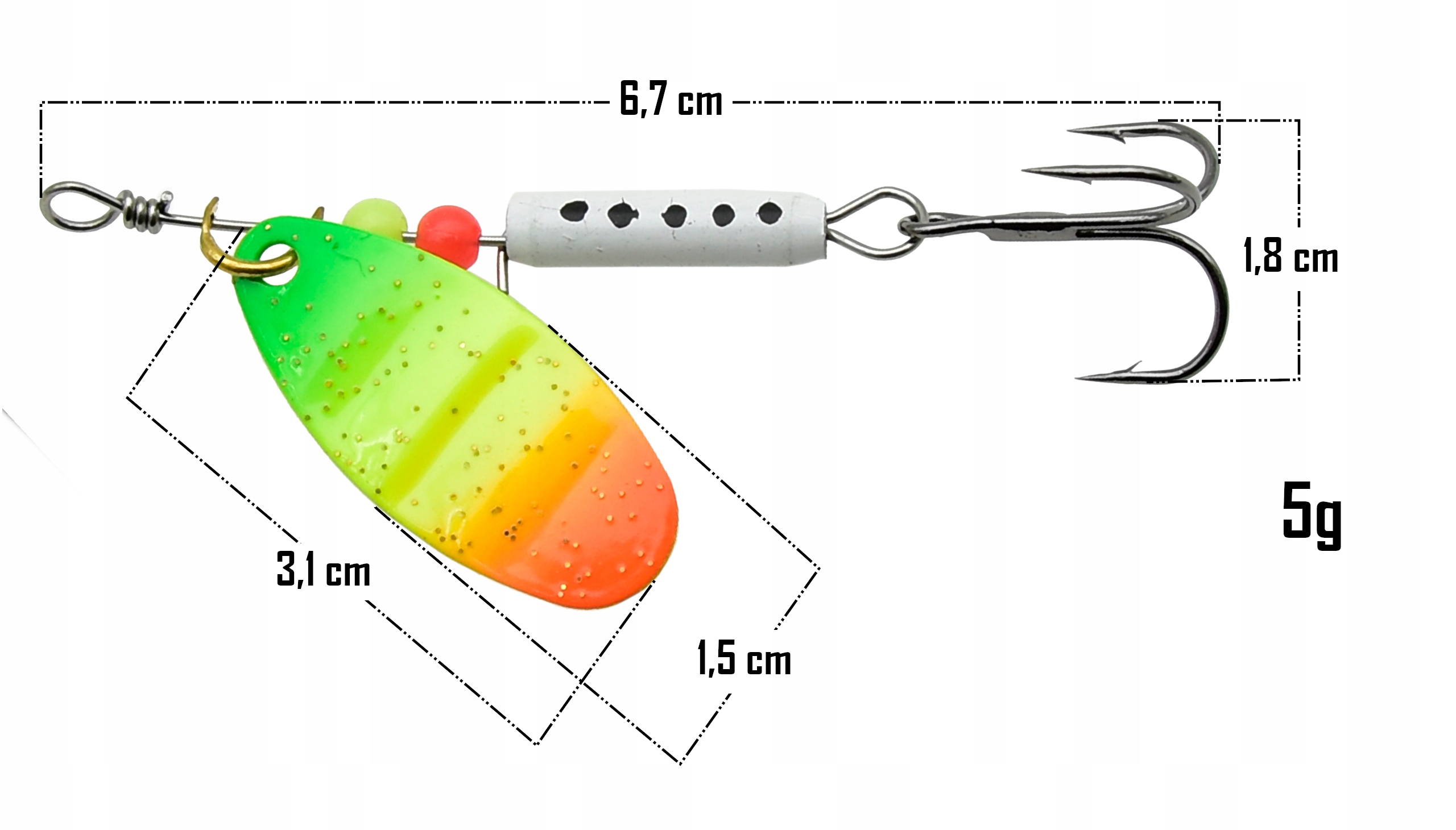 Błystka obrotowa o wadze 5 gramów to niezawodna przynęta, która sprawdzi się w każdych warunkach – zarówno w wodach stojących, jak i w rzekach o umiarkowanym nurcie. Dzięki odpowiedniemu wyważeniu i płynnej pracy skrzydełka skutecznie przyciąga uwagę drapieżników, pobudzając ich instynkt do ataku.