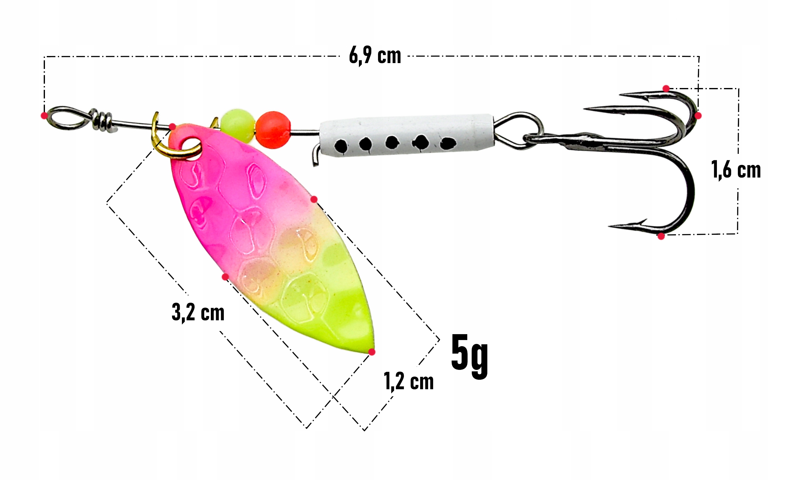 Błystka obrotowa o wadze 5 gramów to niezawodna przynęta, która sprawdzi się w każdych warunkach – zarówno w wodach stojących, jak i w rzekach o umiarkowanym nurcie. Dzięki odpowiedniemu wyważeniu i płynnej pracy skrzydełka skutecznie przyciąga uwagę drapieżników, pobudzając ich instynkt do ataku.