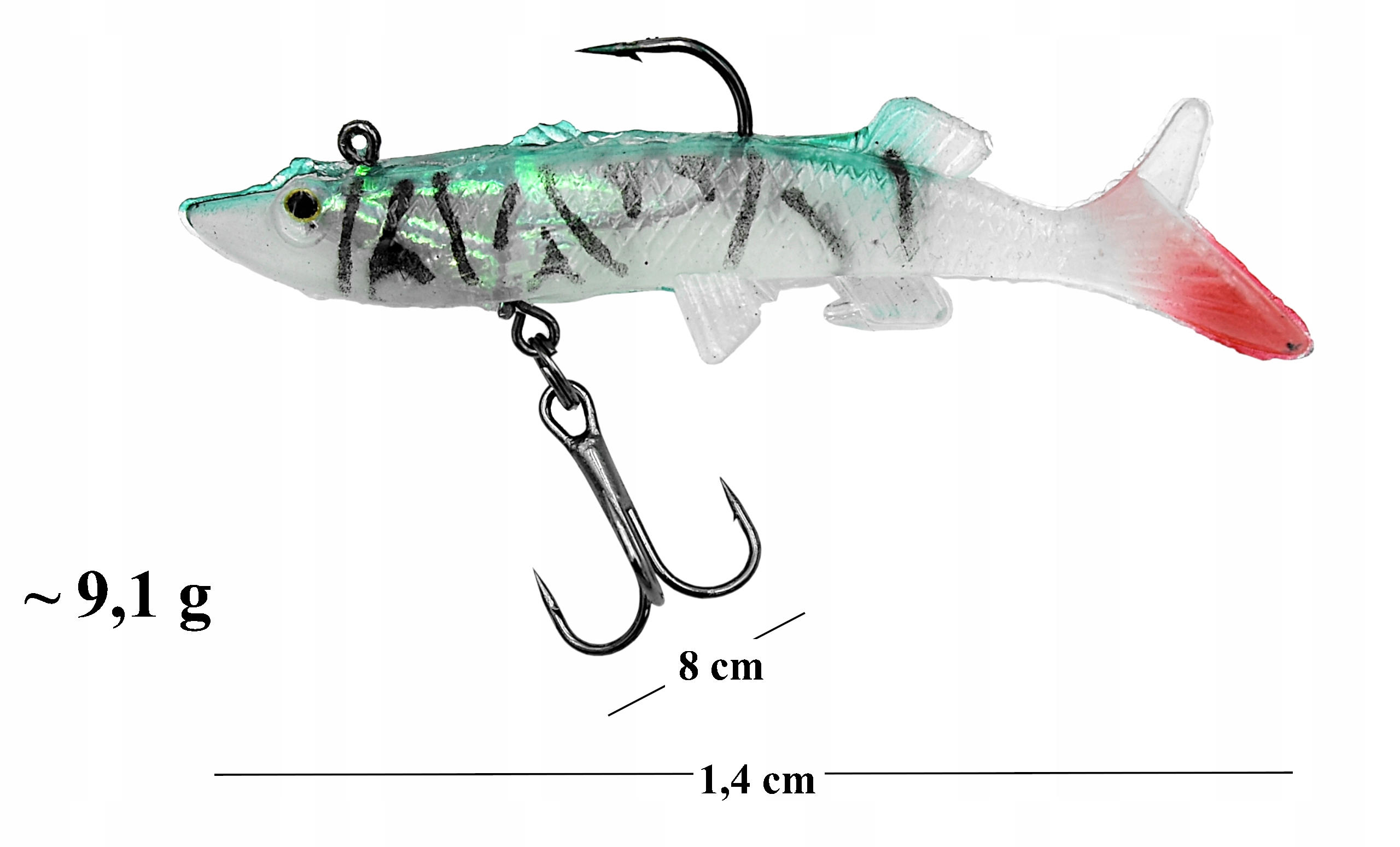 Proponowane przez nas przynęty posiadają trójwymiarowe wklejane oczy oraz charakterystycznie uformowaną płetwę ogonową w stylu kopyta z masywnym ogonem - co sprawia, że uzyskuje ona odpowiedni ruch w wodzie nawet przy najdelikatniejszym obrocie kołowrotka. Dodatkowo gumy uzbrojone są w hak i kotwiczkę oraz posiadają własne obciążenie. Przynęty tego typu sprawdzają się zarówno w jeziorze, na morzu jak i rzece o silniejszym nurcie. Perfekcyjnie dobrana kolorystyka, agresywna praca, to tylko niektóre z atutów tej przynęty.