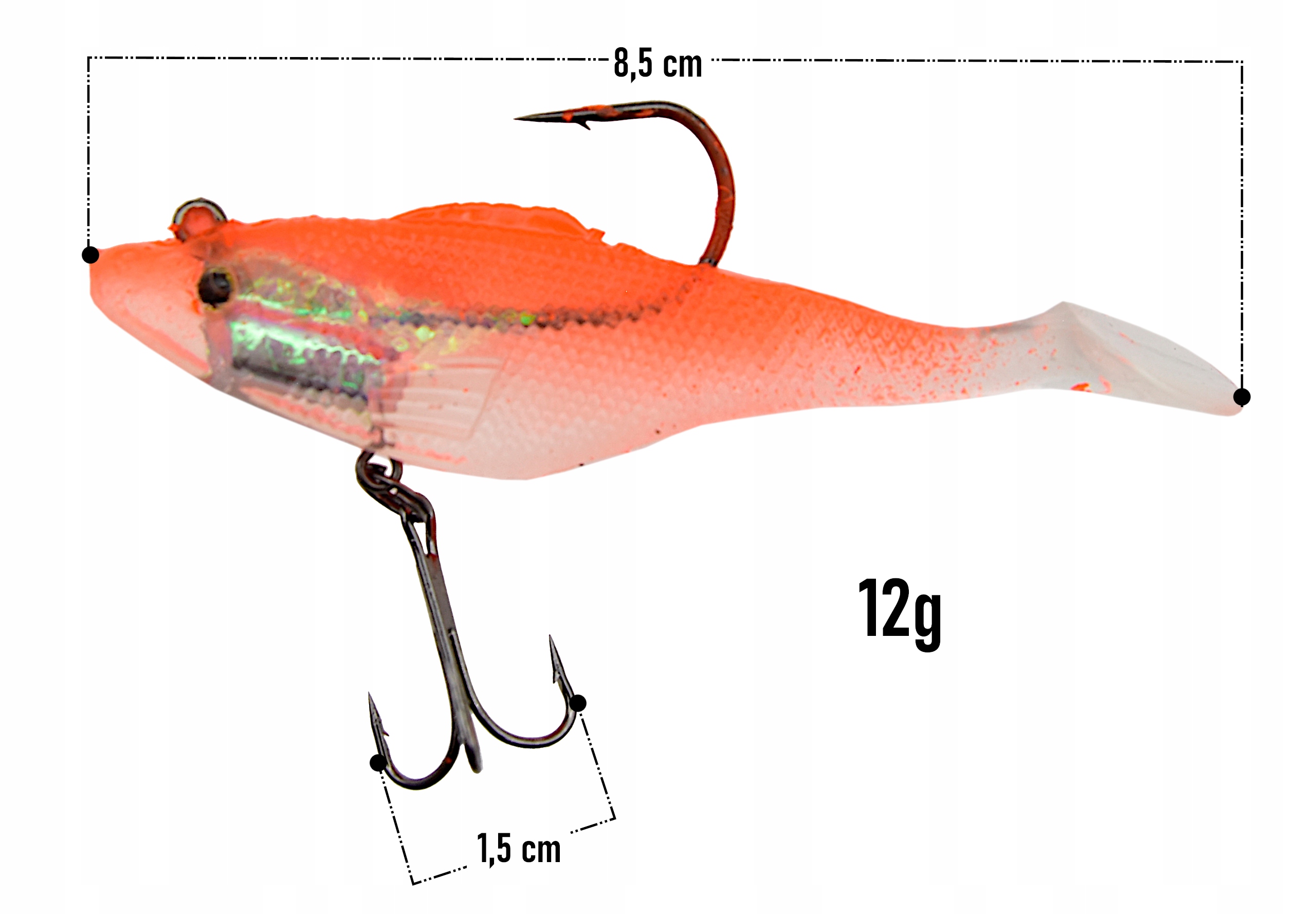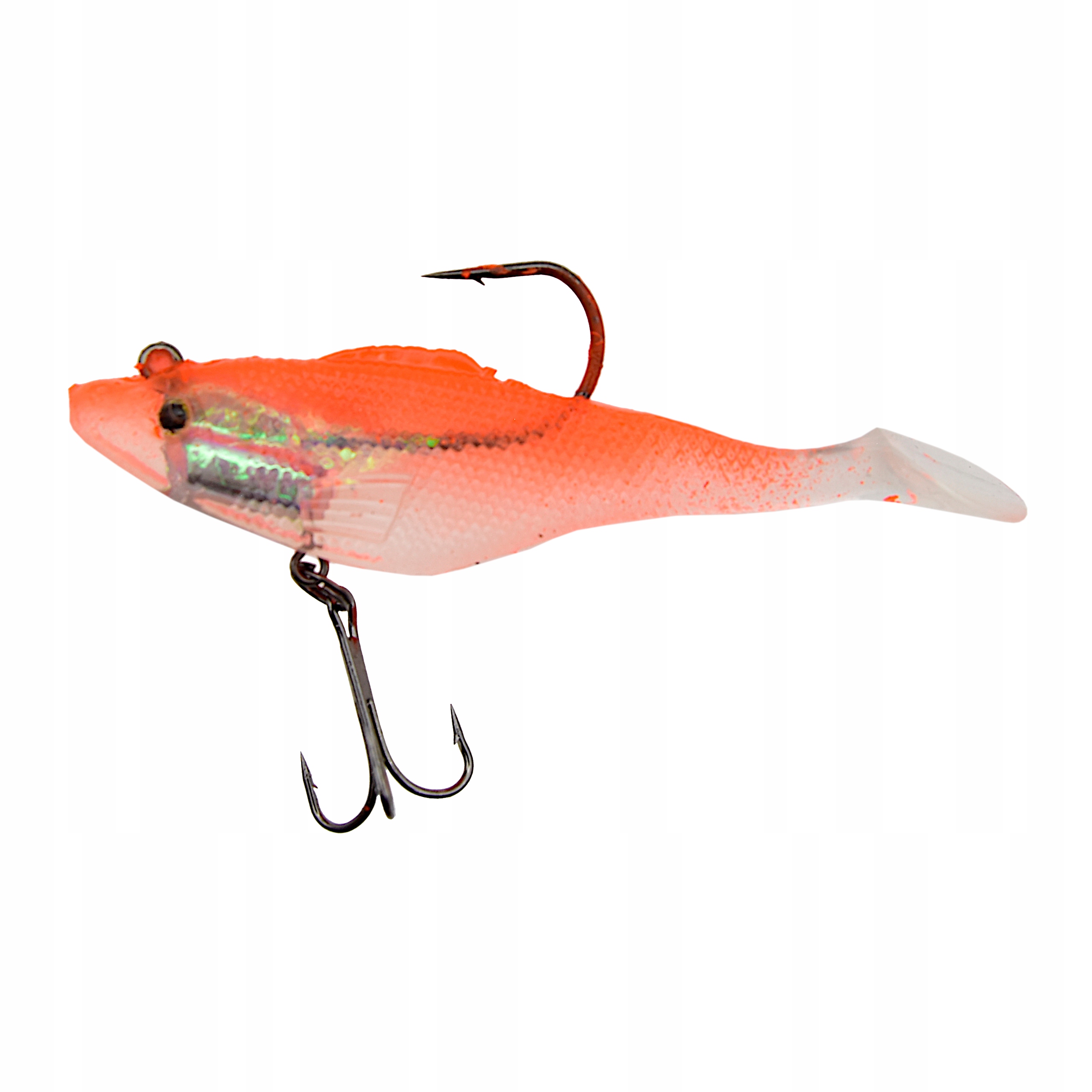 Proponowane przez nas przynęty posiadają trójwymiarowe wklejane oczy oraz charakterystycznie uformowaną płetwę ogonową w stylu kopyta - co sprawia, że uzyskuje ona odpowiedni ruch w wodzie nawet przy najdelikatniejszym obrocie kołowrotka. Dodatkowo gumy uzbrojone są w główkę jigową i kotwiczkę oraz posiadają własne obciążenie. Przynęty tego typu sprawdzają się zarówno w jeziorze, na morzu jak i rzece o silniejszym nurcie. Perfekcyjnie dobrana kolorystyka, agresywna praca, to tylko niektóre z atutów tej przynęty.