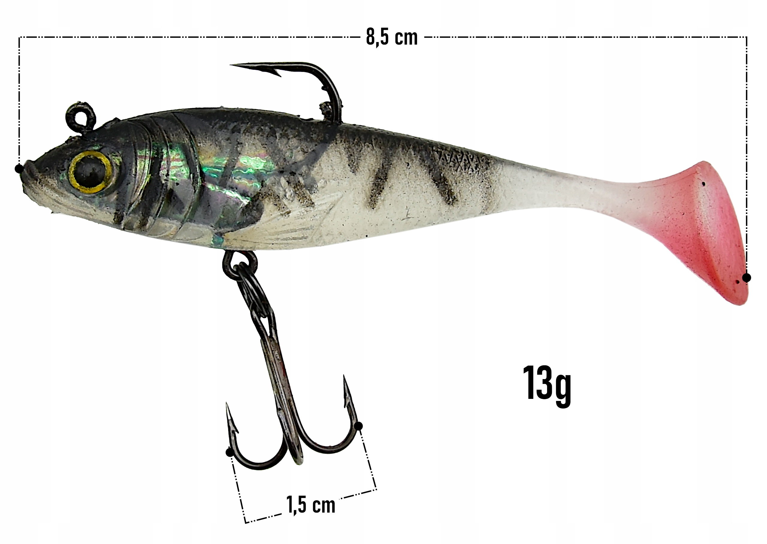 Proponowane przez nas przynęty posiadają trójwymiarowe wklejane oczy oraz charakterystycznie uformowaną płetwę ogonową w stylu kopyta - co sprawia, że uzyskuje ona odpowiedni ruch w wodzie nawet przy najdelikatniejszym obrocie kołowrotka. Dodatkowo gumy uzbrojone są w główkę jigową i kotwiczkę oraz posiadają własne obciążenie. Przynęty tego typu sprawdzają się zarówno w jeziorze, na morzu jak i rzece o silniejszym nurcie. Perfekcyjnie dobrana kolorystyka, agresywna praca, to tylko niektóre z atutów tej przynęty.