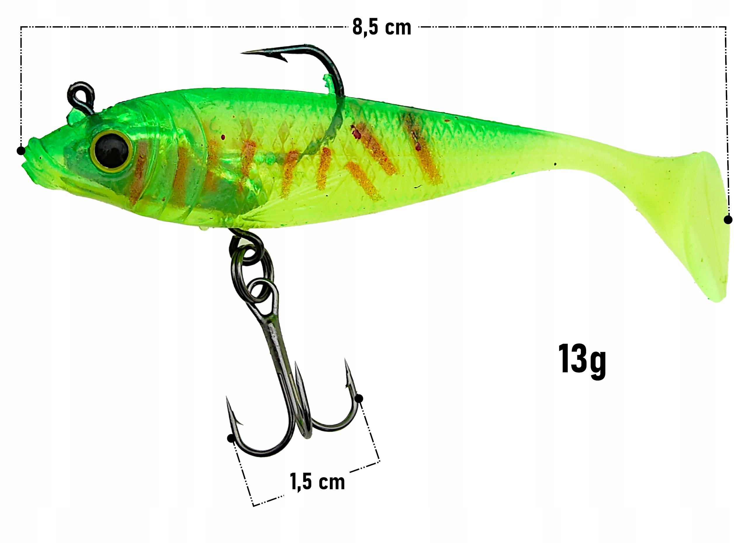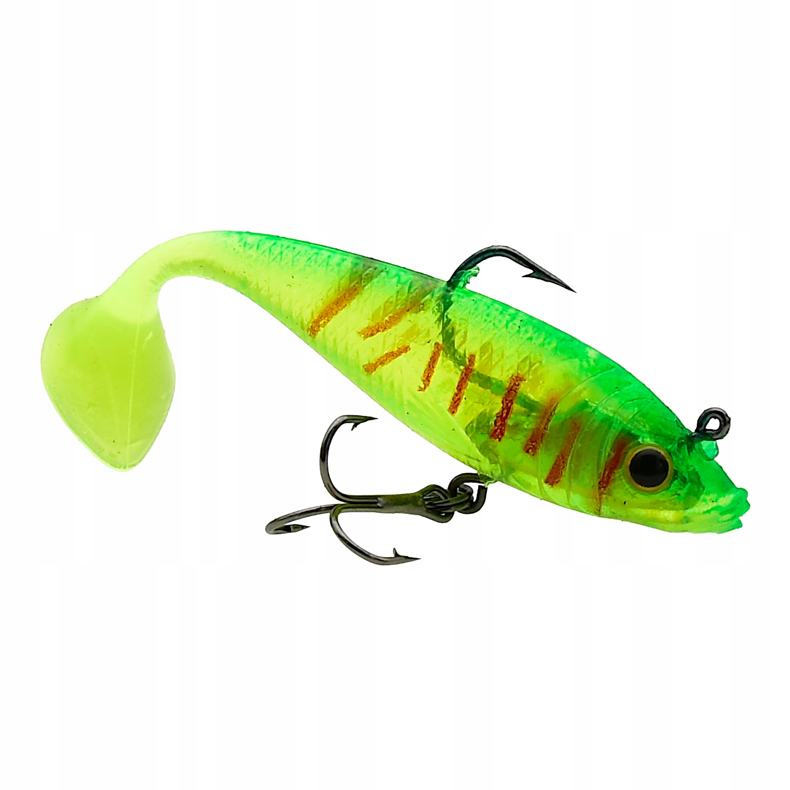 Proponowane przez nas przynęty posiadają trójwymiarowe wklejane oczy oraz charakterystycznie uformowaną płetwę ogonową w stylu kopyta - co sprawia, że uzyskuje ona odpowiedni ruch w wodzie nawet przy najdelikatniejszym obrocie kołowrotka. Dodatkowo gumy uzbrojone są w główkę jigową i kotwiczkę oraz posiadają własne obciążenie. Przynęty tego typu sprawdzają się zarówno w jeziorze, na morzu jak i rzece o silniejszym nurcie. Perfekcyjnie dobrana kolorystyka, agresywna praca, to tylko niektóre z atutów tej przynęty.