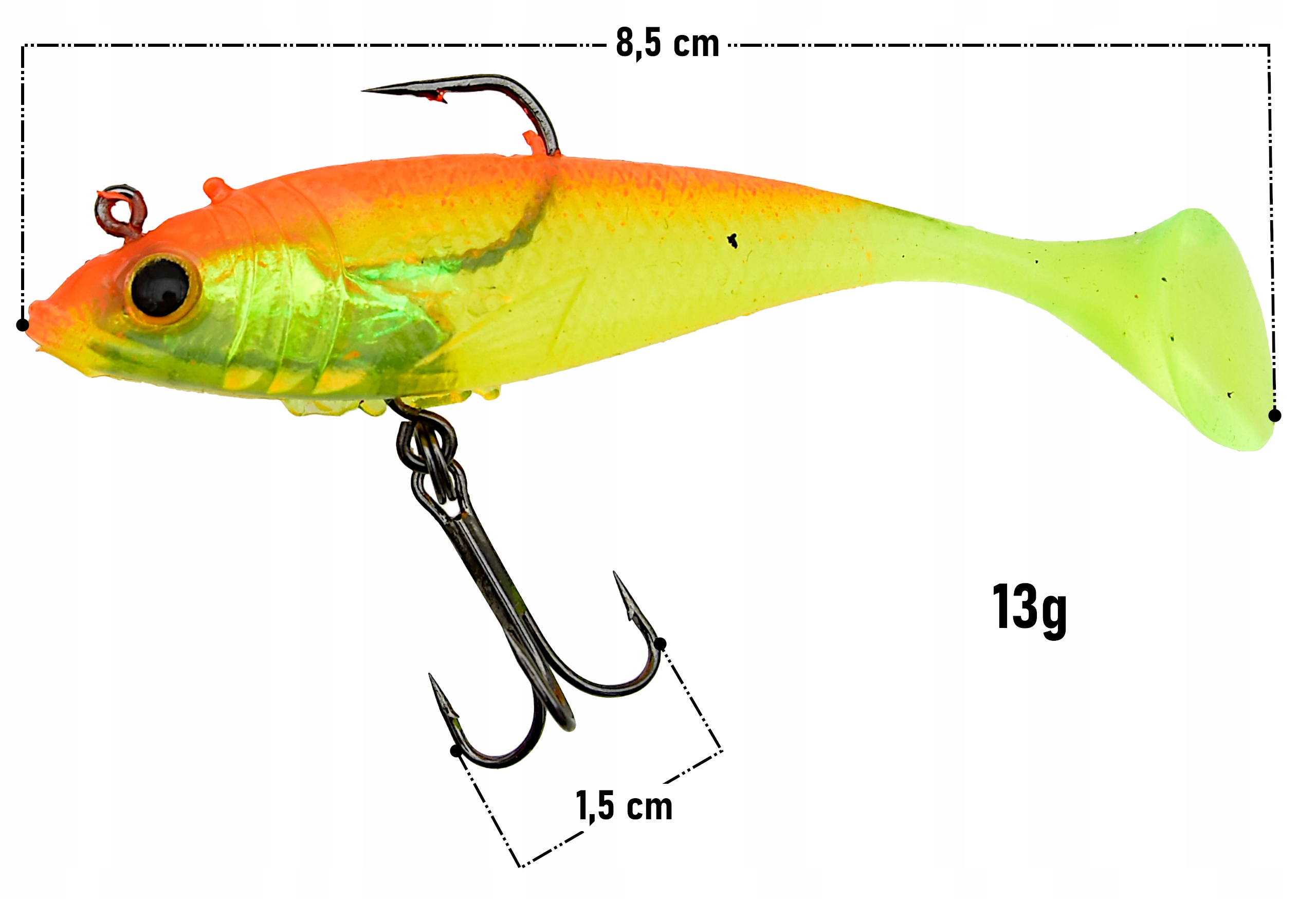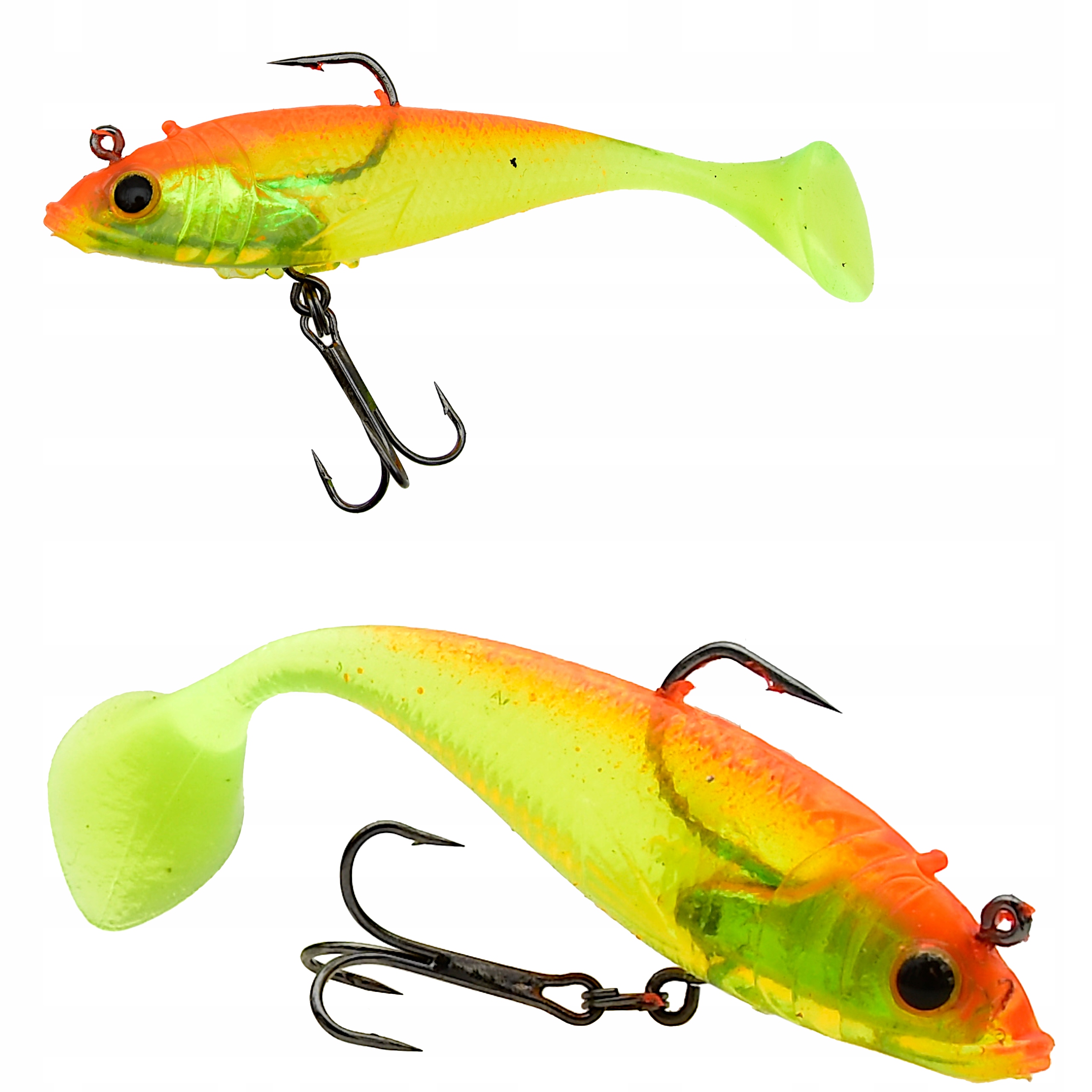 Proponowane przez nas przynęty posiadają trójwymiarowe wklejane oczy oraz charakterystycznie uformowaną płetwę ogonową w stylu kopyta - co sprawia, że uzyskuje ona odpowiedni ruch w wodzie nawet przy najdelikatniejszym obrocie kołowrotka. Dodatkowo gumy uzbrojone są w główkę jigową i kotwiczkę oraz posiadają własne obciążenie. Przynęty tego typu sprawdzają się zarówno w jeziorze, na morzu jak i rzece o silniejszym nurcie. Perfekcyjnie dobrana kolorystyka, agresywna praca, to tylko niektóre z atutów tej przynęty.