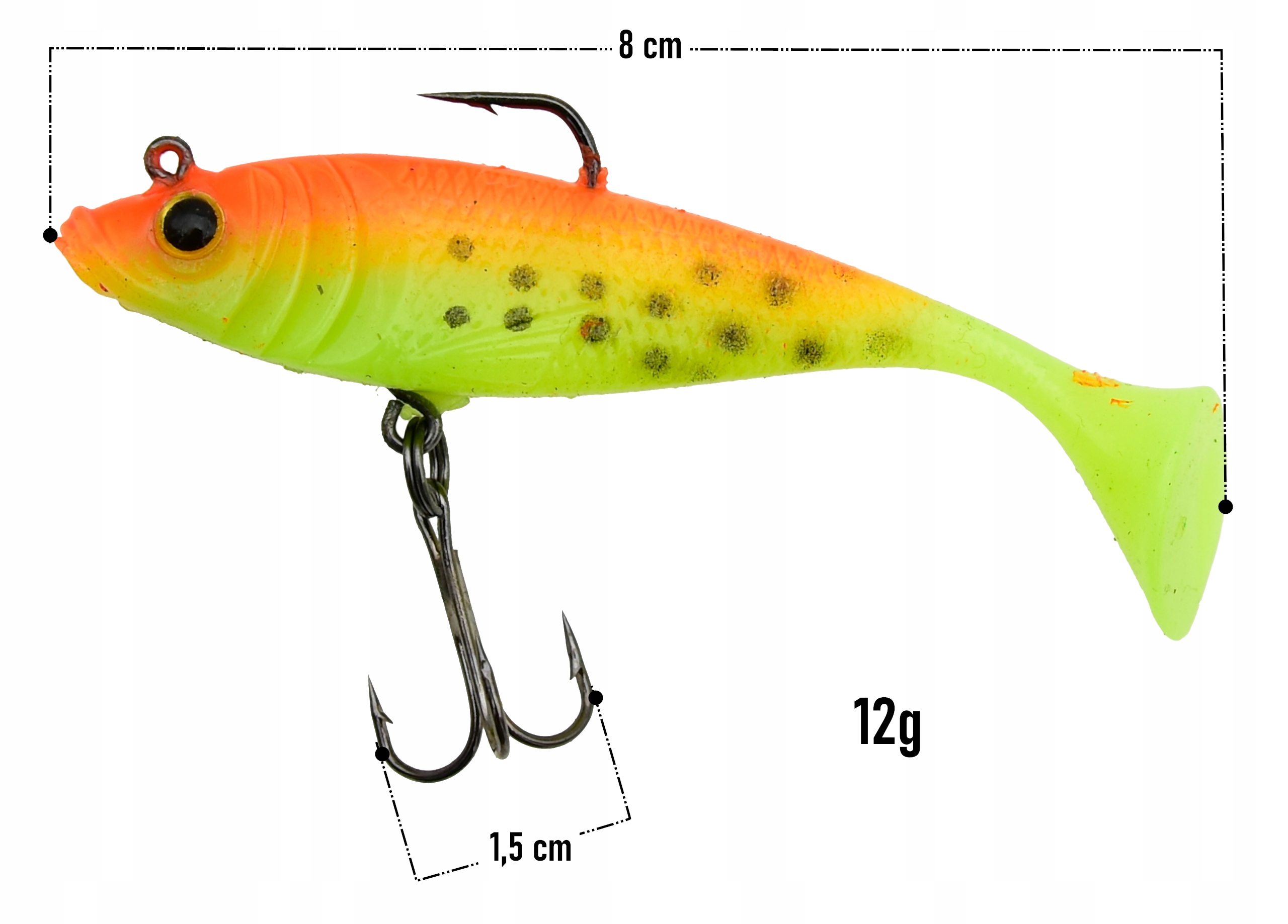 Proponowane przez nas przynęty posiadają trójwymiarowe wklejane oczy oraz charakterystycznie uformowaną płetwę ogonową w stylu kopyta - co sprawia, że uzyskuje ona odpowiedni ruch w wodzie nawet przy najdelikatniejszym obrocie kołowrotka. Dodatkowo gumy uzbrojone są w główkę jigową i kotwiczkę oraz posiadają własne obciążenie. Przynęty tego typu sprawdzają się zarówno w jeziorze, na morzu jak i rzece o silniejszym nurcie. Perfekcyjnie dobrana kolorystyka, agresywna praca, to tylko niektóre z atutów tej przynęty.