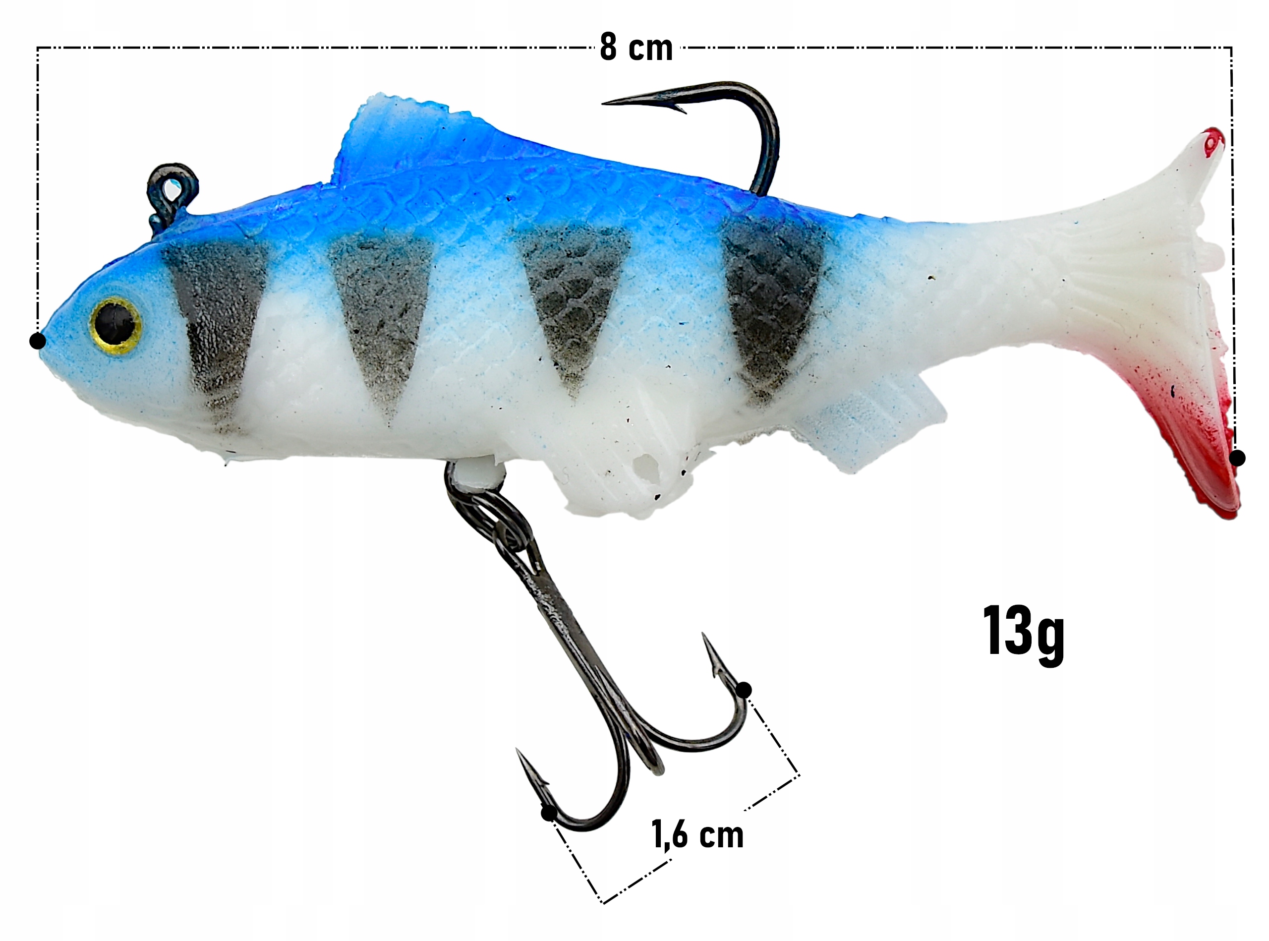 Proponowane przez nas przynęty posiadają trójwymiarowe wklejane oczy oraz charakterystycznie uformowaną płetwę ogonową w stylu kopyta - co sprawia, że uzyskuje ona odpowiedni ruch w wodzie nawet przy najdelikatniejszym obrocie kołowrotka. Dodatkowo gumy uzbrojone są w główkę jigową i kotwiczkę oraz posiadają własne obciążenie. Przynęty tego typu sprawdzają się zarówno w jeziorze, na morzu jak i rzece o silniejszym nurcie. Perfekcyjnie dobrana kolorystyka, agresywna praca, to tylko niektóre z atutów tej przynęty.