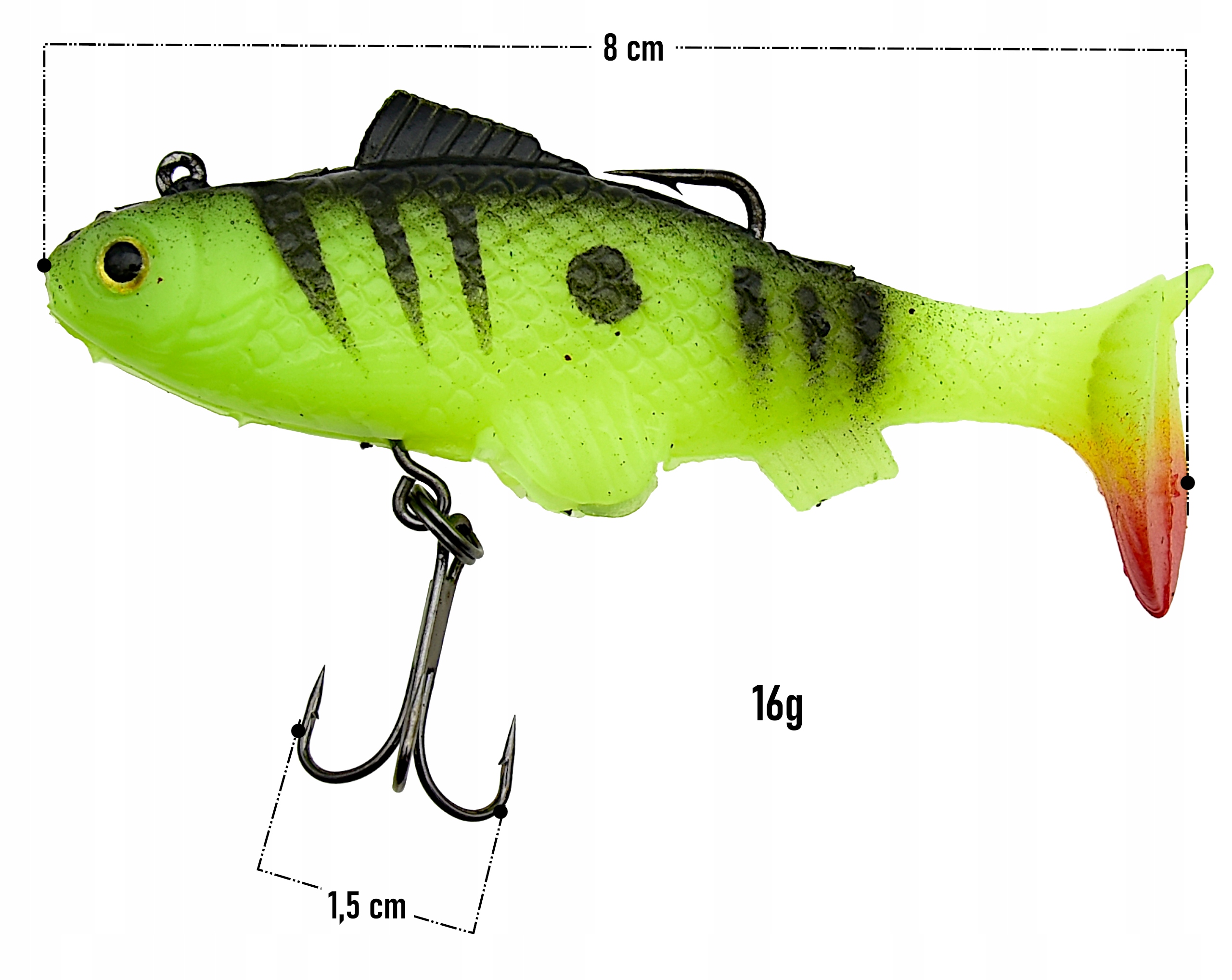 Proponowane przez nas przynęty posiadają trójwymiarowe wklejane oczy oraz charakterystycznie uformowaną płetwę ogonową w stylu kopyta - co sprawia, że uzyskuje ona odpowiedni ruch w wodzie nawet przy najdelikatniejszym obrocie kołowrotka. Dodatkowo gumy uzbrojone są w główkę jigową i kotwiczkę oraz posiadają własne obciążenie. Przynęty tego typu sprawdzają się zarówno w jeziorze, na morzu jak i rzece o silniejszym nurcie. Perfekcyjnie dobrana kolorystyka, agresywna praca, to tylko niektóre z atutów tej przynęty.