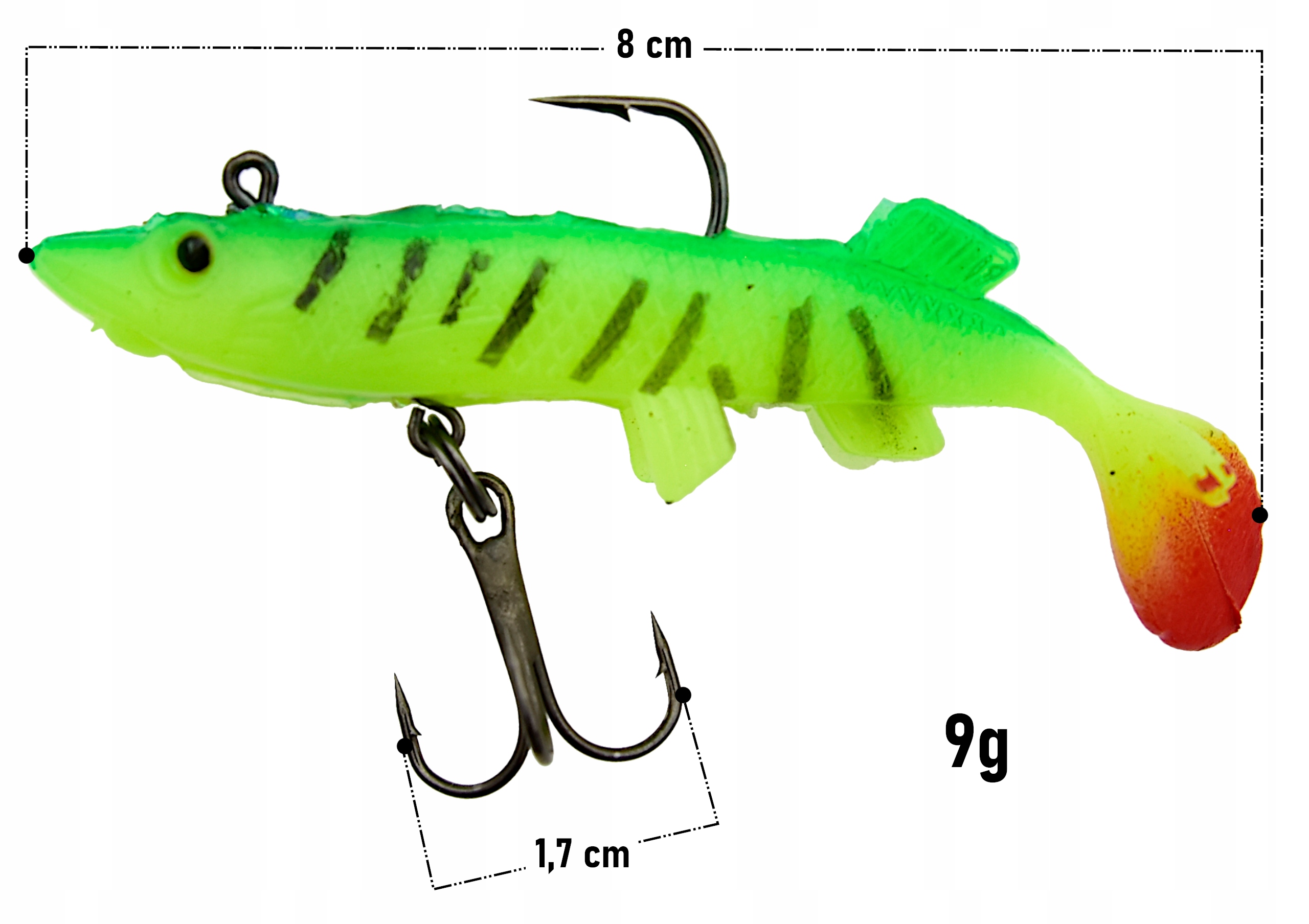 Proponowane przez nas przynęty posiadają trójwymiarowe wklejane oczy oraz charakterystycznie uformowaną płetwę ogonową w stylu kopyta - co sprawia, że uzyskuje ona odpowiedni ruch w wodzie nawet przy najdelikatniejszym obrocie kołowrotka. Dodatkowo gumy uzbrojone są w główkę jigową i kotwiczkę oraz posiadają własne obciążenie. Przynęty tego typu sprawdzają się zarówno w jeziorze, na morzu jak i rzece o silniejszym nurcie. Perfekcyjnie dobrana kolorystyka, agresywna praca, to tylko niektóre z atutów tej przynęty.
