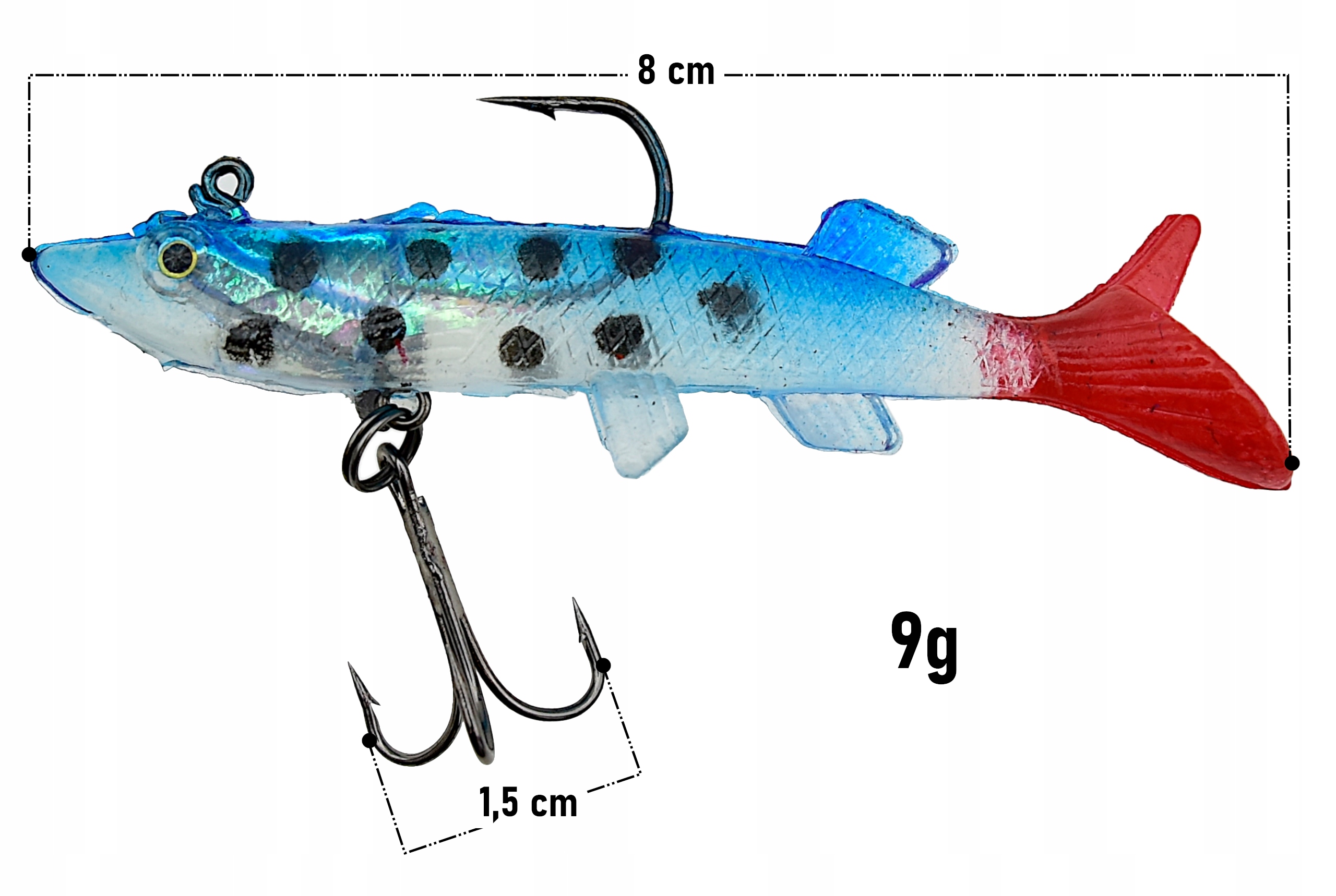 Proponowane przez nas przynęty posiadają trójwymiarowe wklejane oczy oraz charakterystycznie uformowaną płetwę ogonową w stylu kopyta - co sprawia, że uzyskuje ona odpowiedni ruch w wodzie nawet przy najdelikatniejszym obrocie kołowrotka. Dodatkowo gumy uzbrojone są w główkę jigową i kotwiczkę oraz posiadają własne obciążenie. Przynęty tego typu sprawdzają się zarówno w jeziorze, na morzu jak i rzece o silniejszym nurcie. Perfekcyjnie dobrana kolorystyka, agresywna praca, to tylko niektóre z atutów tej przynęty.