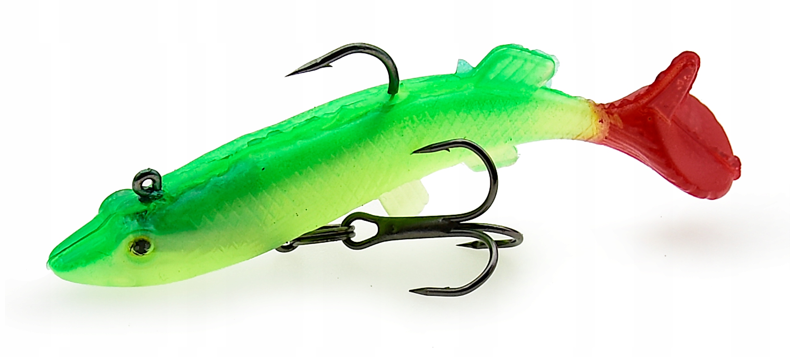 Proponowane przez nas przynęty posiadają trójwymiarowe wklejane oczy oraz charakterystycznie uformowaną płetwę ogonową w stylu kopyta z masywnym ogonem - co sprawia, że uzyskuje ona odpowiedni ruch w wodzie nawet przy najdelikatniejszym obrocie kołowrotka. Dodatkowo gumy uzbrojone są w hak i kotwiczkę oraz posiadają własne obciążenie. Przynęty tego typu sprawdzają się zarówno w jeziorze, na morzu jak i rzece o silniejszym nurcie. Perfekcyjnie dobrana kolorystyka, agresywna praca, to tylko niektóre z atutów tej przynęty.