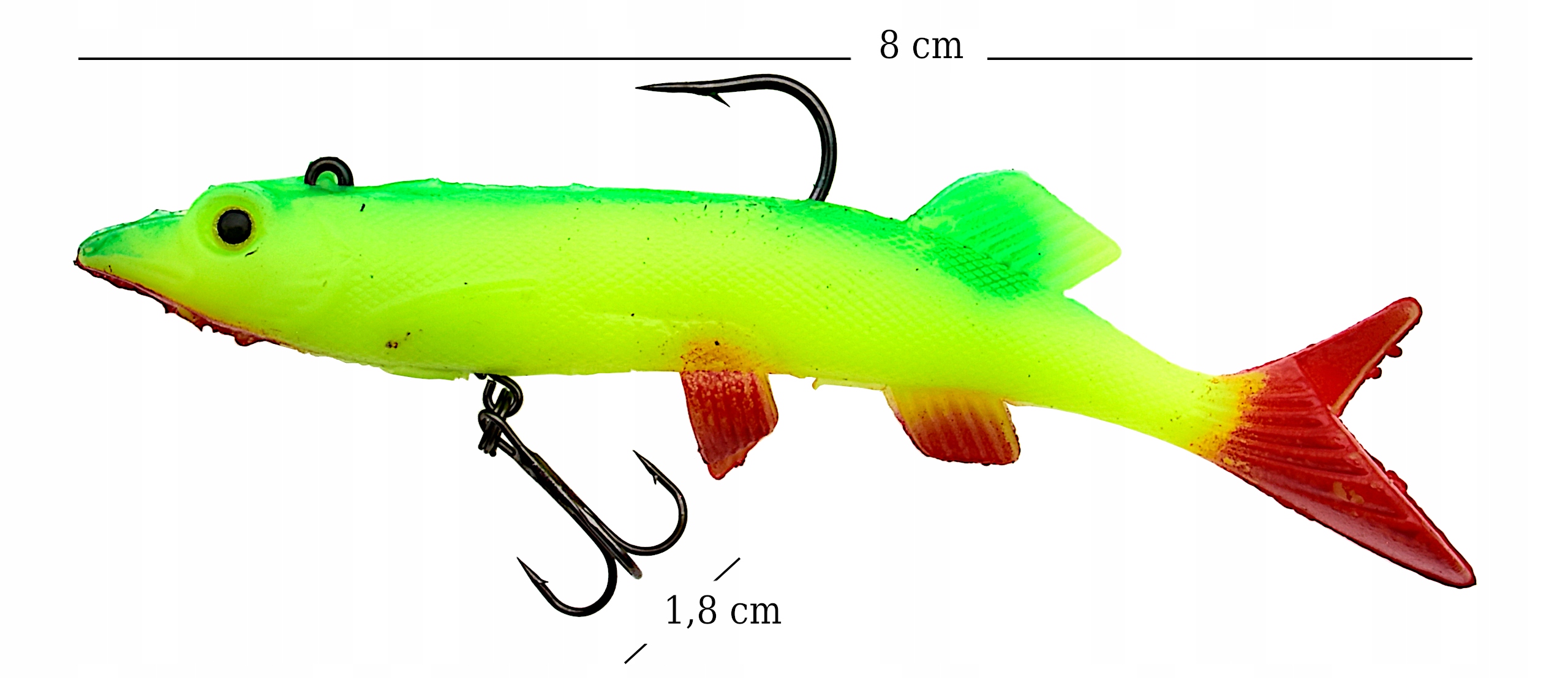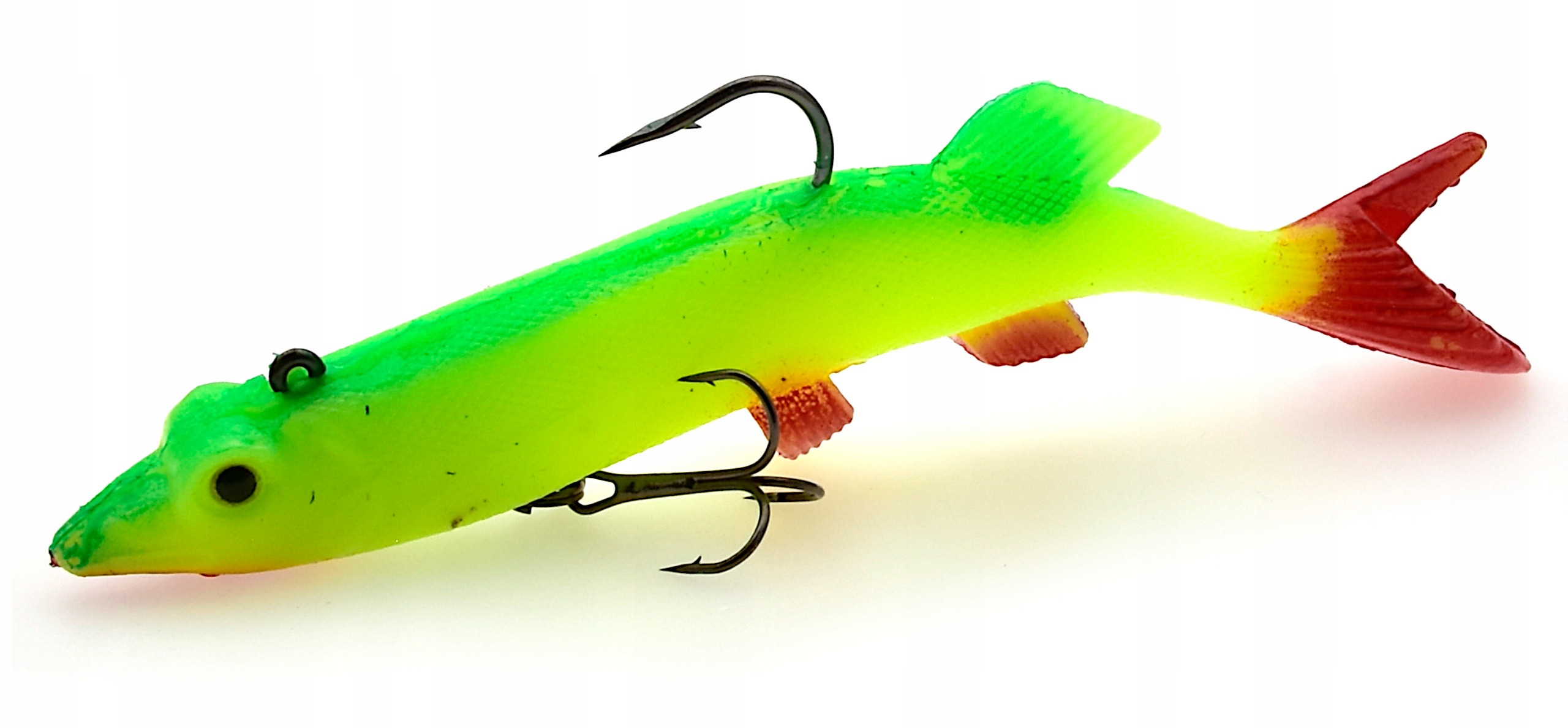 Proponowane przez nas przynęty posiadają trójwymiarowe wklejane oczy oraz charakterystycznie uformowaną płetwę ogonową w stylu kopyta z masywnym ogonem - co sprawia, że uzyskuje ona odpowiedni ruch w wodzie nawet przy najdelikatniejszym obrocie kołowrotka. Dodatkowo gumy uzbrojone są w hak i kotwiczkę oraz posiadają własne obciążenie. Przynęty tego typu sprawdzają się zarówno w jeziorze, na morzu jak i rzece o silniejszym nurcie. Perfekcyjnie dobrana kolorystyka, agresywna praca, to tylko niektóre z atutów tej przynęty.
