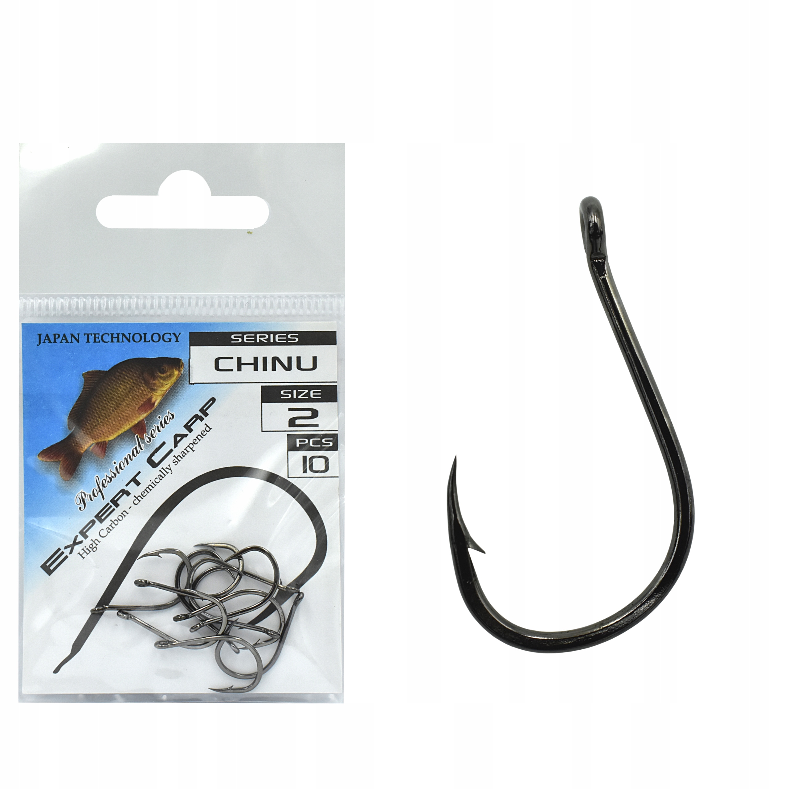 CHINU- Profesjonalna seria bardzo mocnych, ostrych i łownych haczyków o poszerzonym łuku kolankowym; zakończonych uszkiem. Haczyki dostępne w szerokiej gamie rozmiarów - (inne rozmiary dostępne na pozostałych aukcjach). Łowny haczyk z szerokim kolankiem o uniwersalnym przeznaczeniu polecany do łowienia na kukurydzę, łubin, ciasto, pasty, pęczak oraz ziemniaki. Większe rozmiary sprawdzają się do łowienia Karpi.