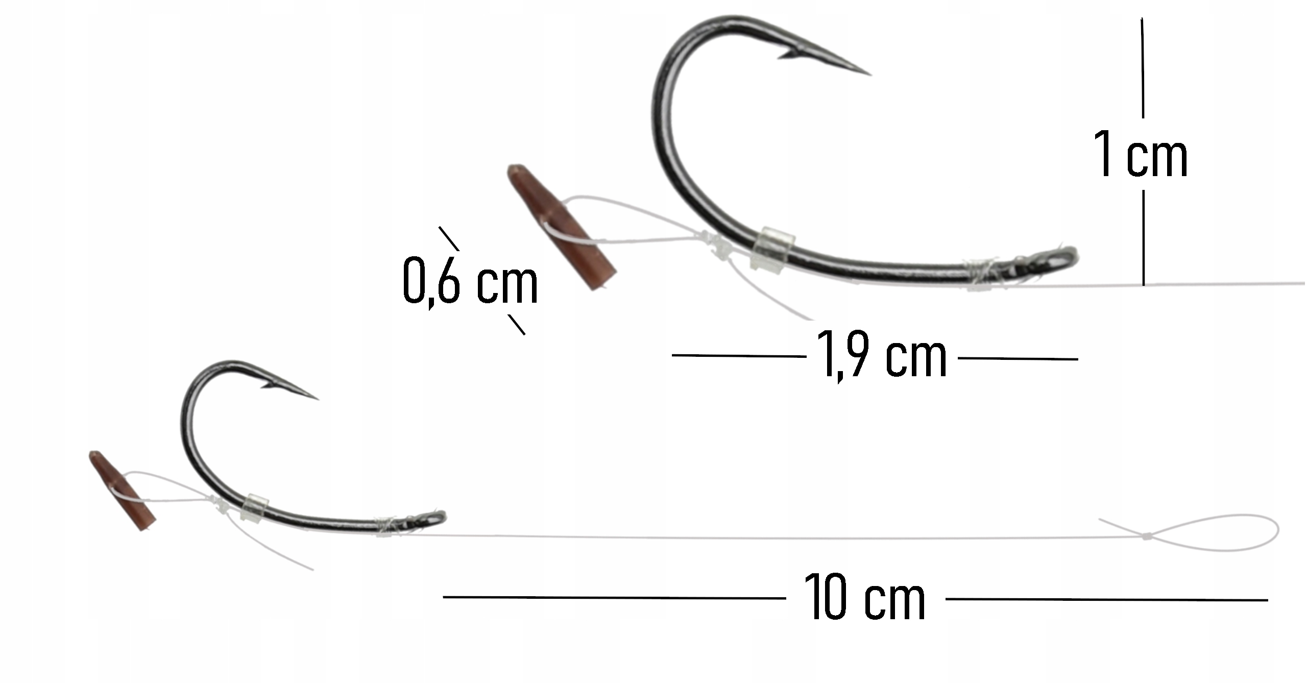 Haczyki na przyponie z żyłki dedykowane do method feeder. Gotowe przypony posiadają bardzo ostre haczyki oraz wytrzymałą żyłkę. Przypon zakończony jest stoperem do kulek proteinowych, peletu i innych przynęt.