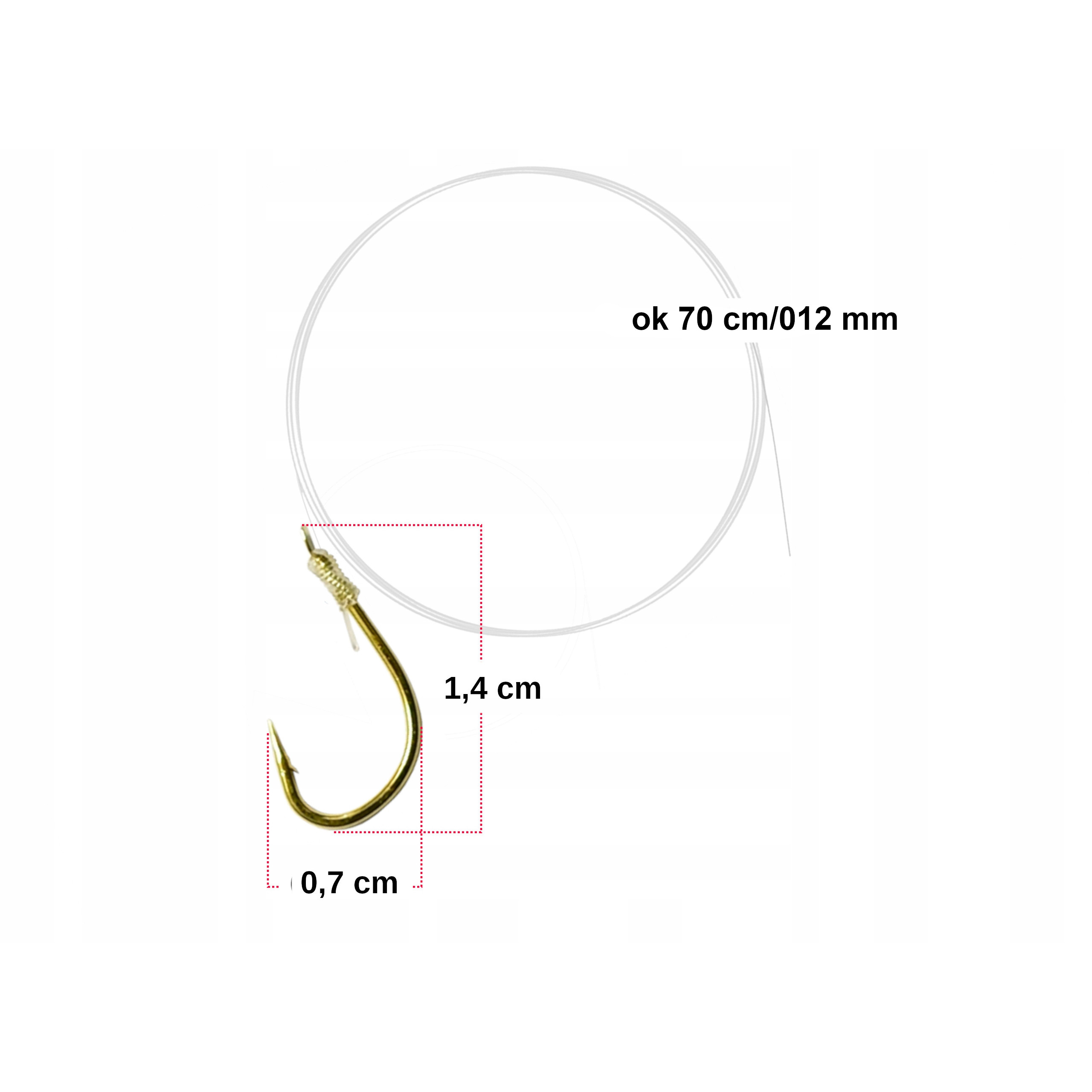 Długość przyponu to ok. 70 cm / 0,12 mm, haczyk rozmiar 10