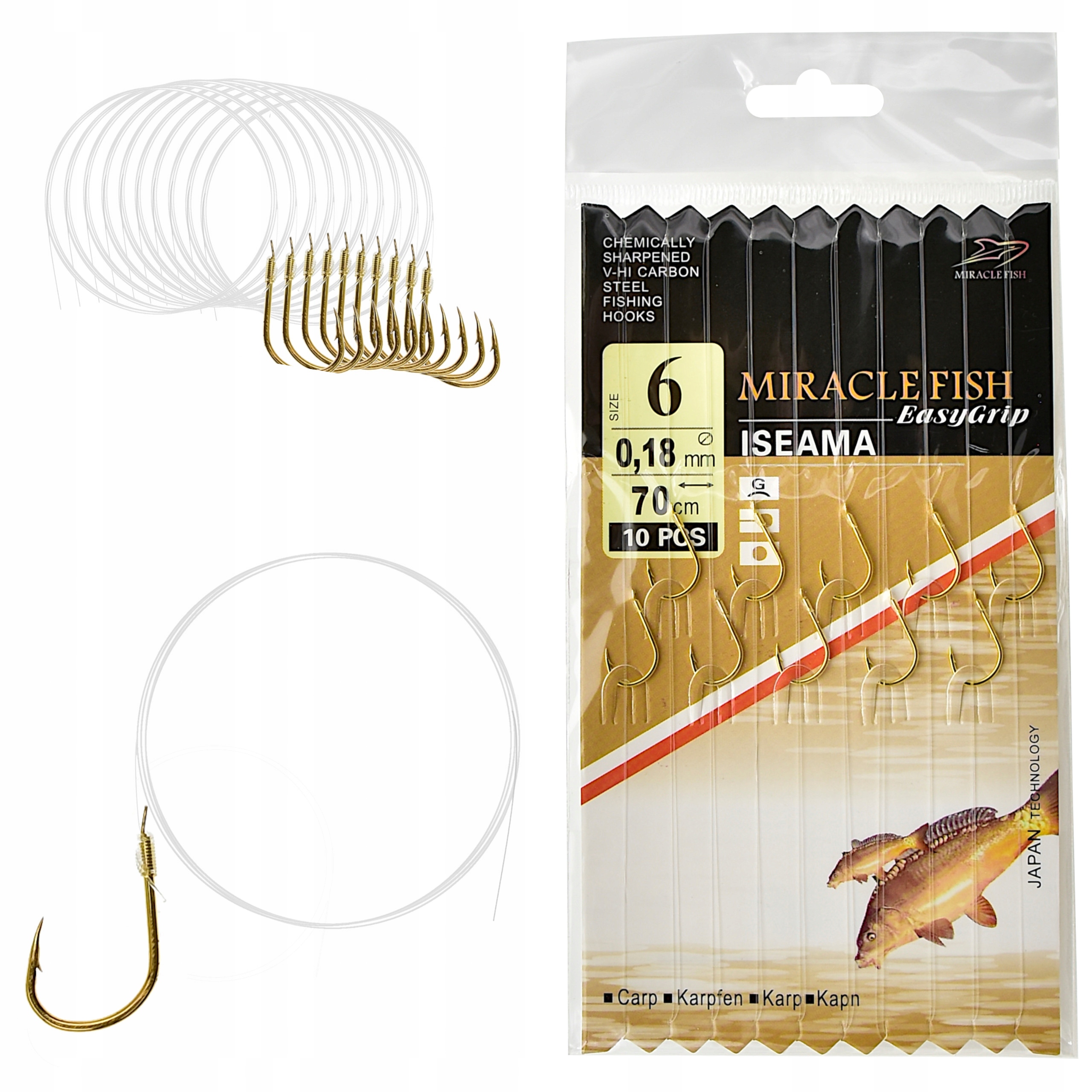Haczyki WIĄZANE ISEAMA na przyponie z żyłki ok 70cm/0,18mm GOTOWE 10szt r 6