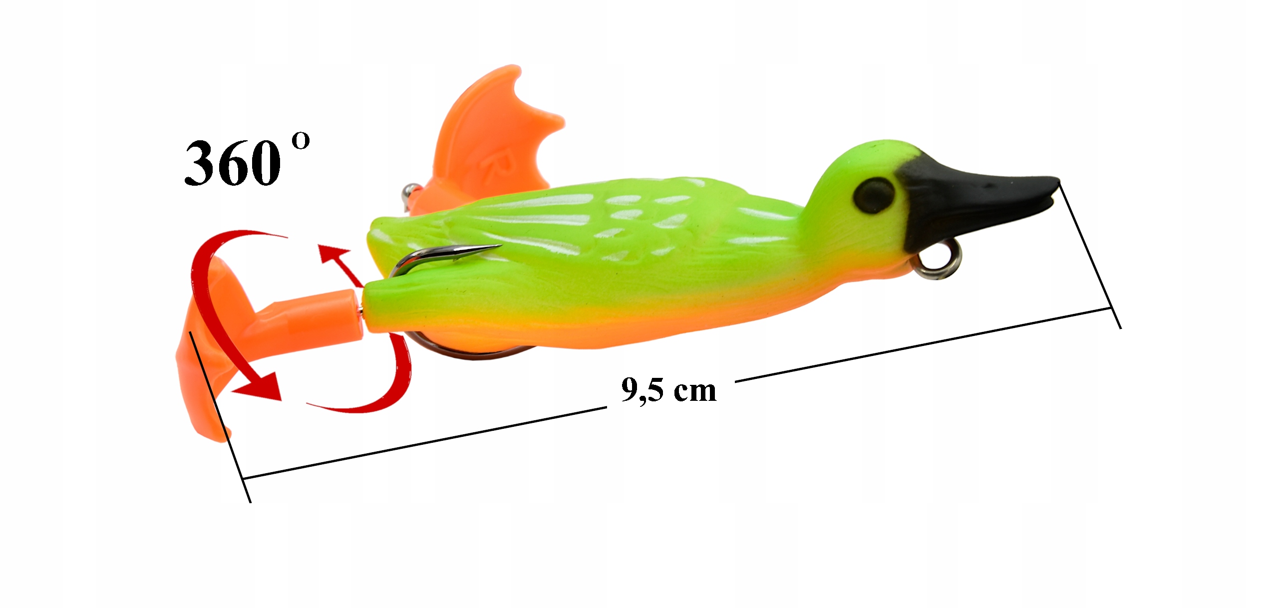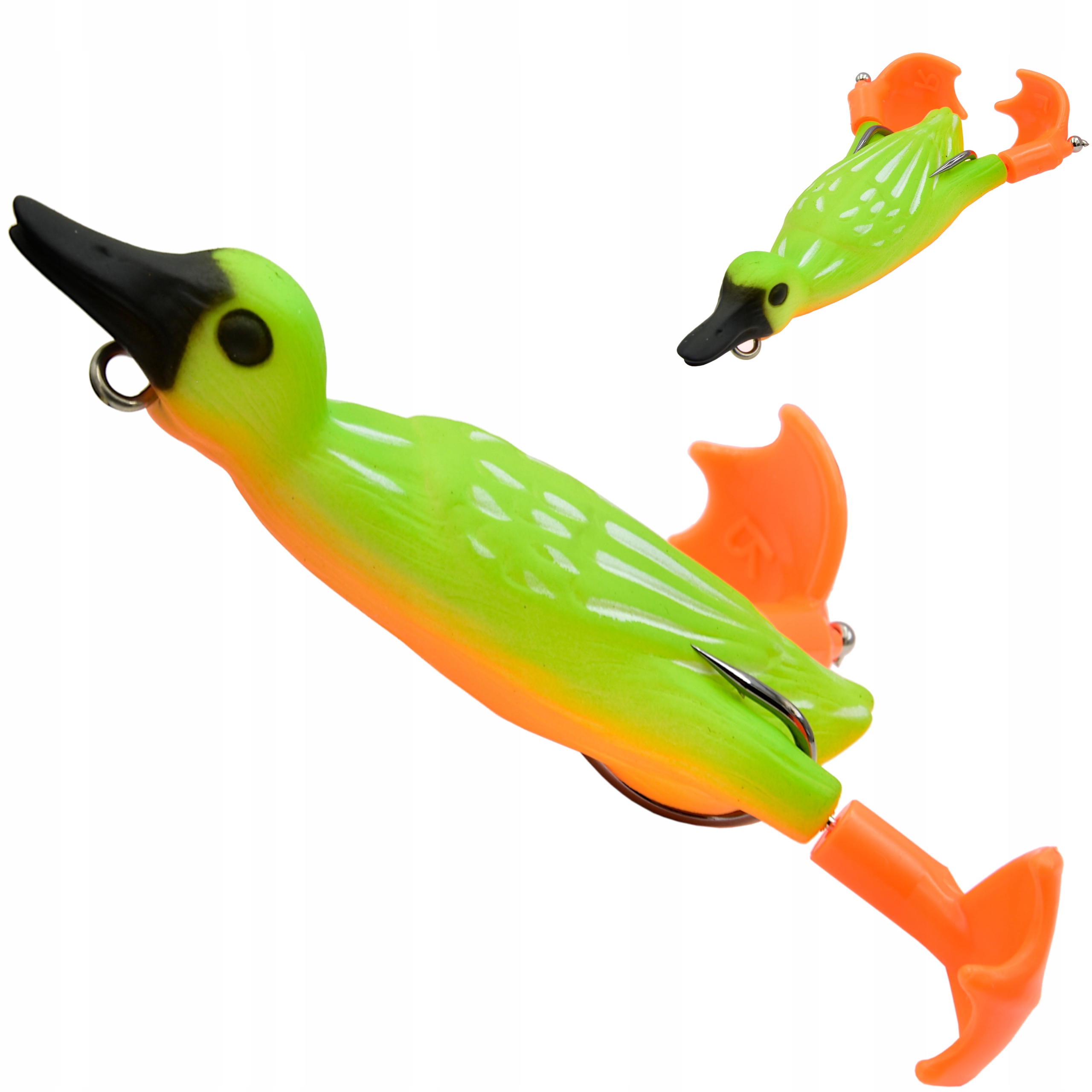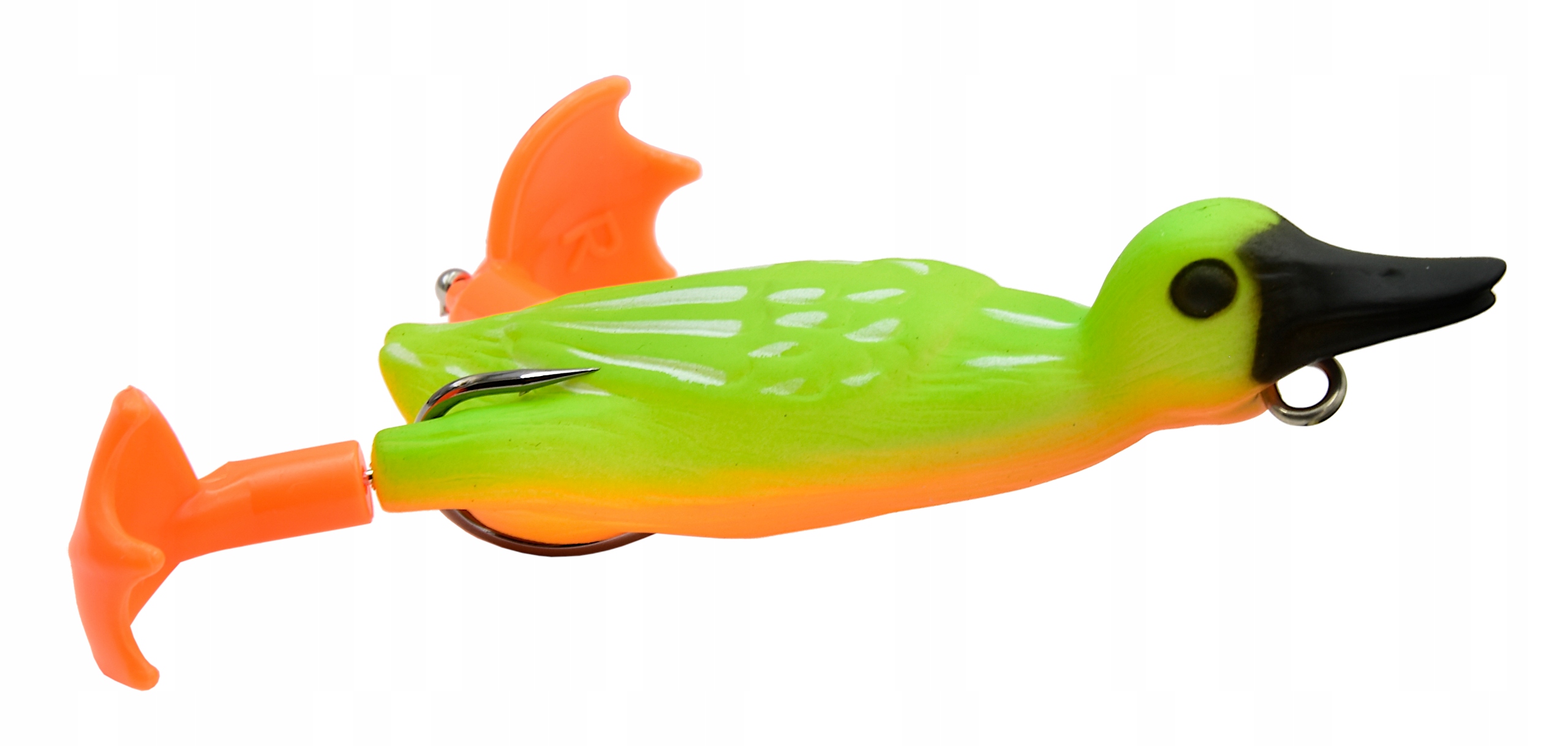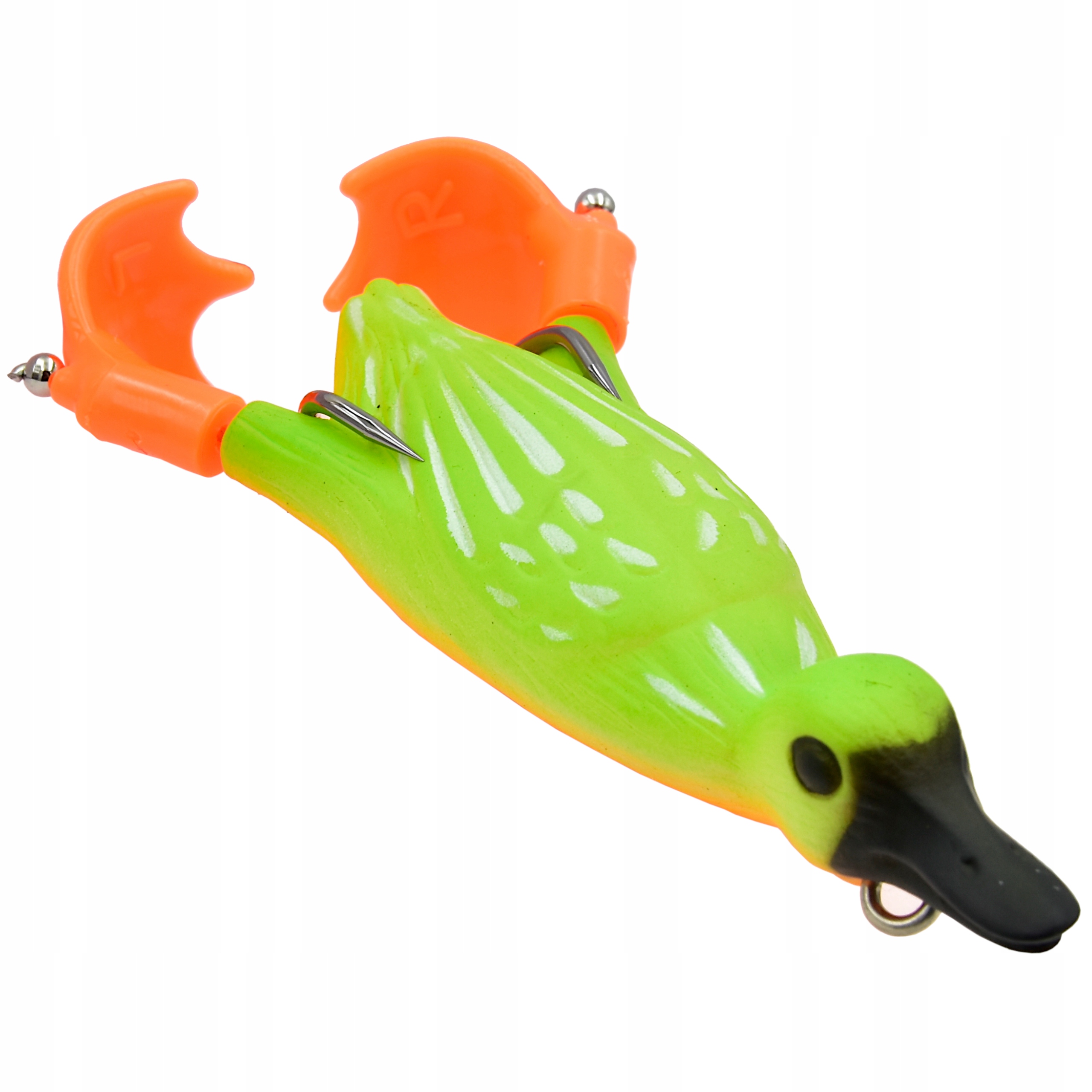 Imitacje małych Kaczuszek pływających po wodzie, o bardzo realistycznym kształcie, puste w środku uzbrojone w podwójną, bardzo ostrą kotwicę oraz intensywnie pracujące, sylikonowe chwosty udające płetwy.