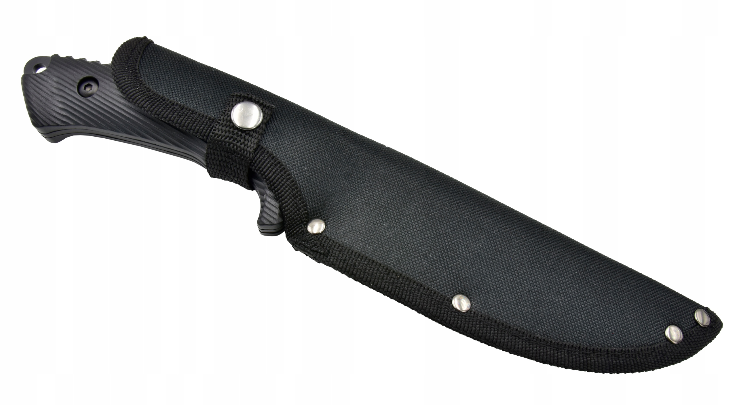 Konstrukcja full tang zapewnia maksymalną wytrzymałość narzędzia i nawet w przypadku uszkodzenia okładziny rękojeści, nóż nadal jest w pełni gotowy do swojej pracy. Jelec oraz idealnie wyprofilowana rękojeść podnoszą komfort użytkowania. Dodatkowo, w dolnej części rękojeści umiejscowiono otwór umożliwiający przewleczenie linki zabezpieczającej przed przypadkowym wypadnięciem noża z dłoni. Czarne, matowe wykończenie skutecznie eliminuje wszelkiego pochodzenia odblaski i refleksy świetlne.