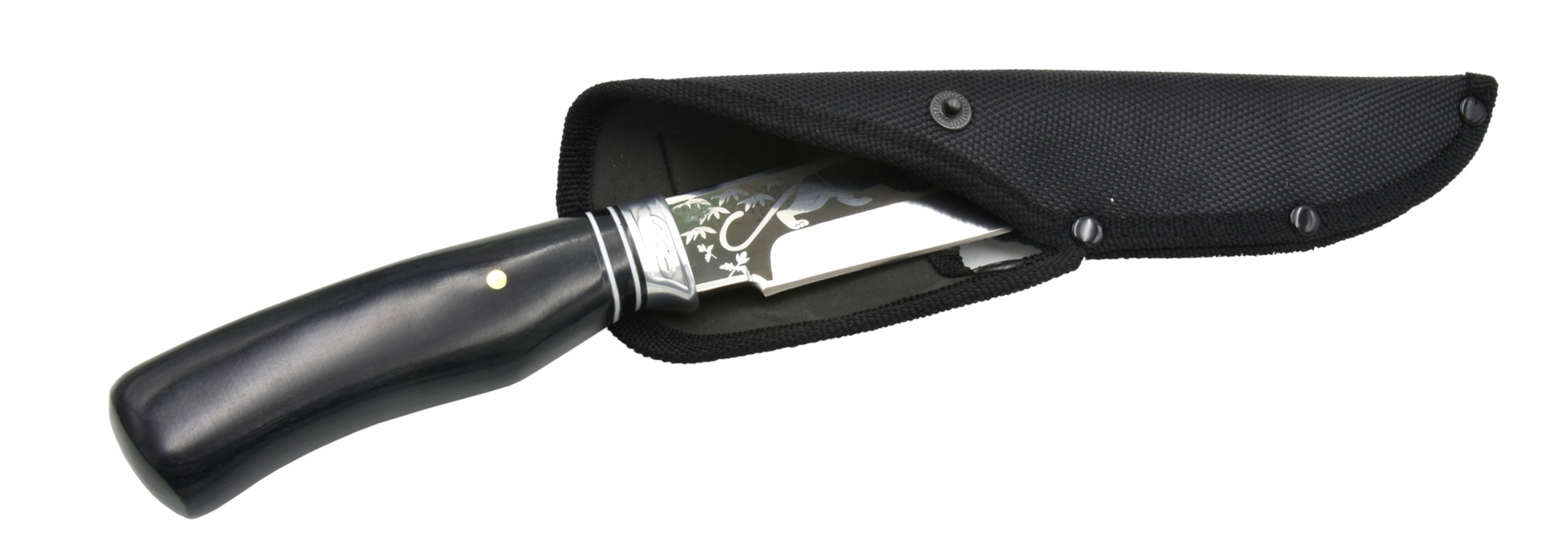 W zestawie otrzymamy piękny nóż oraz pochwę, która jest starannie dopasowana do noża i dodatkowo zapinana metalowym zatrzaskiem co uniemożliwia przypadkowe wysunięcie się z niej noża. Pochwa dodatkowo posiada szlufkę, dzięki której możemy zamocować ją przy pasku.