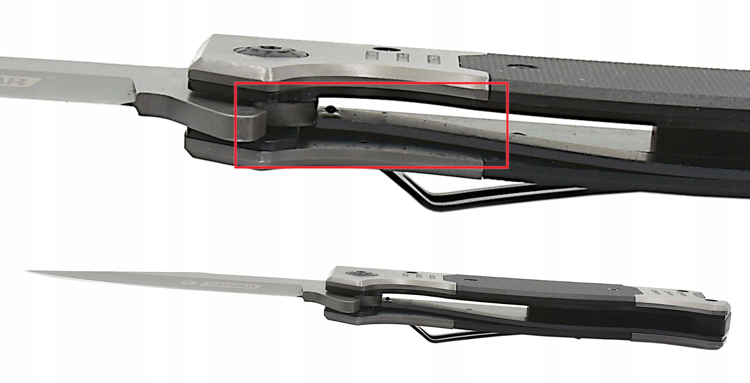 Głownię otworzyć można naciskając palcem wskazującym fliper, który w pozycji rozłożonej noża stanowi skuteczną ochronę przed zsunięciem się dłoni na ostrze. Dodatkowym rozwiązaniem poprawiającym komfort i bezpieczeństwo pracy nożem KANDAR N-87, jest karbowana rampa na grzbiecie głowni, dzięki czemu podczas pracy kciuk znajduje pewne oparcie.