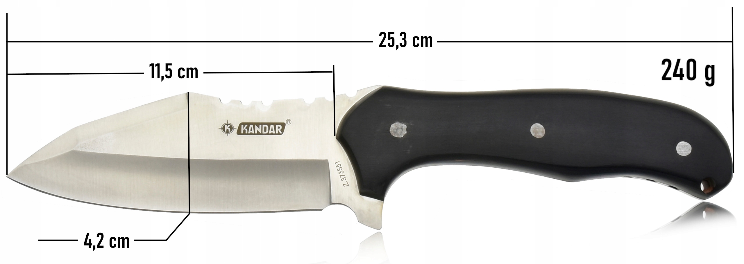 KANDAR N-46-1 to zawodnik wagi ciężkiej – ważący niemal ćwierć kilograma, masywny i wytrzymały nóż survivalowy, który sprosta najtrudniejszym zadaniom nawet w najbardziej ekstremalnych warunkach w jakich się znajdziemy.