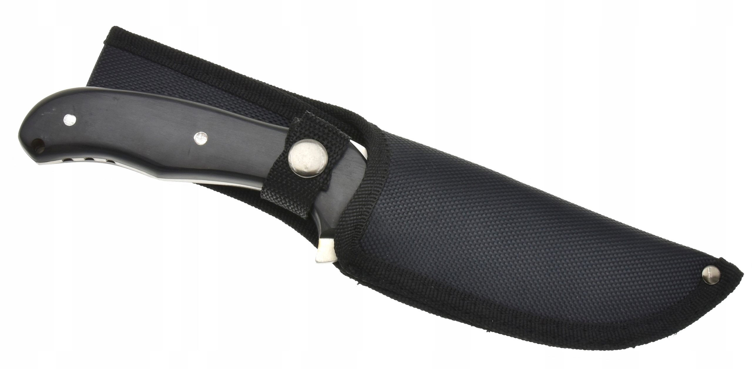 W komplecie z nożem oferowana jest czarna nylonowa pochwa, zapinana na metalowy zatrzask, umożliwiająca zawieszenie noża na pasie, aby zawsze był w zasięgu ręki.
