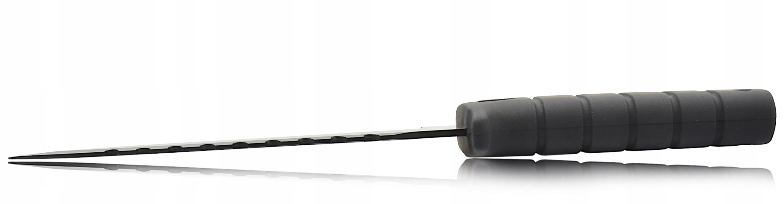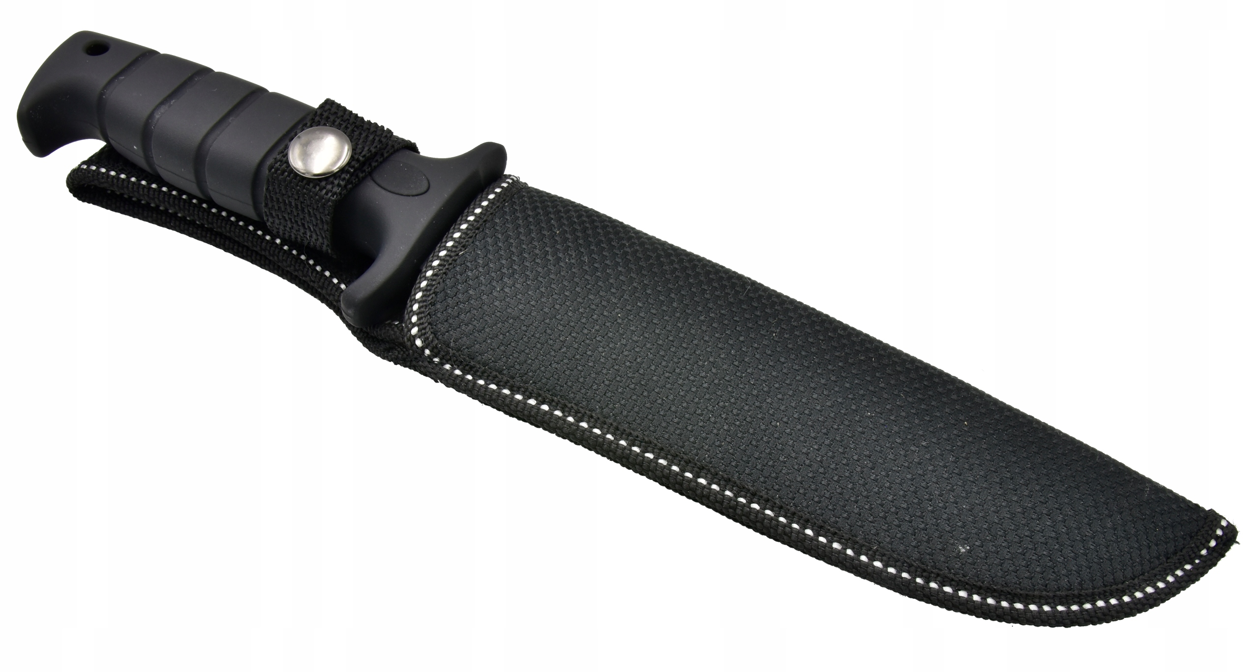 Rękojeść umożliwia pewny chwyt, a niewielki jelec skutecznie zapobiega przypadkowemu zsunięciu się dłoni na ostrze. W komplecie z nożem oferowana jest czarna pochwa z cordury, zapinana na metalowy zatrzask.