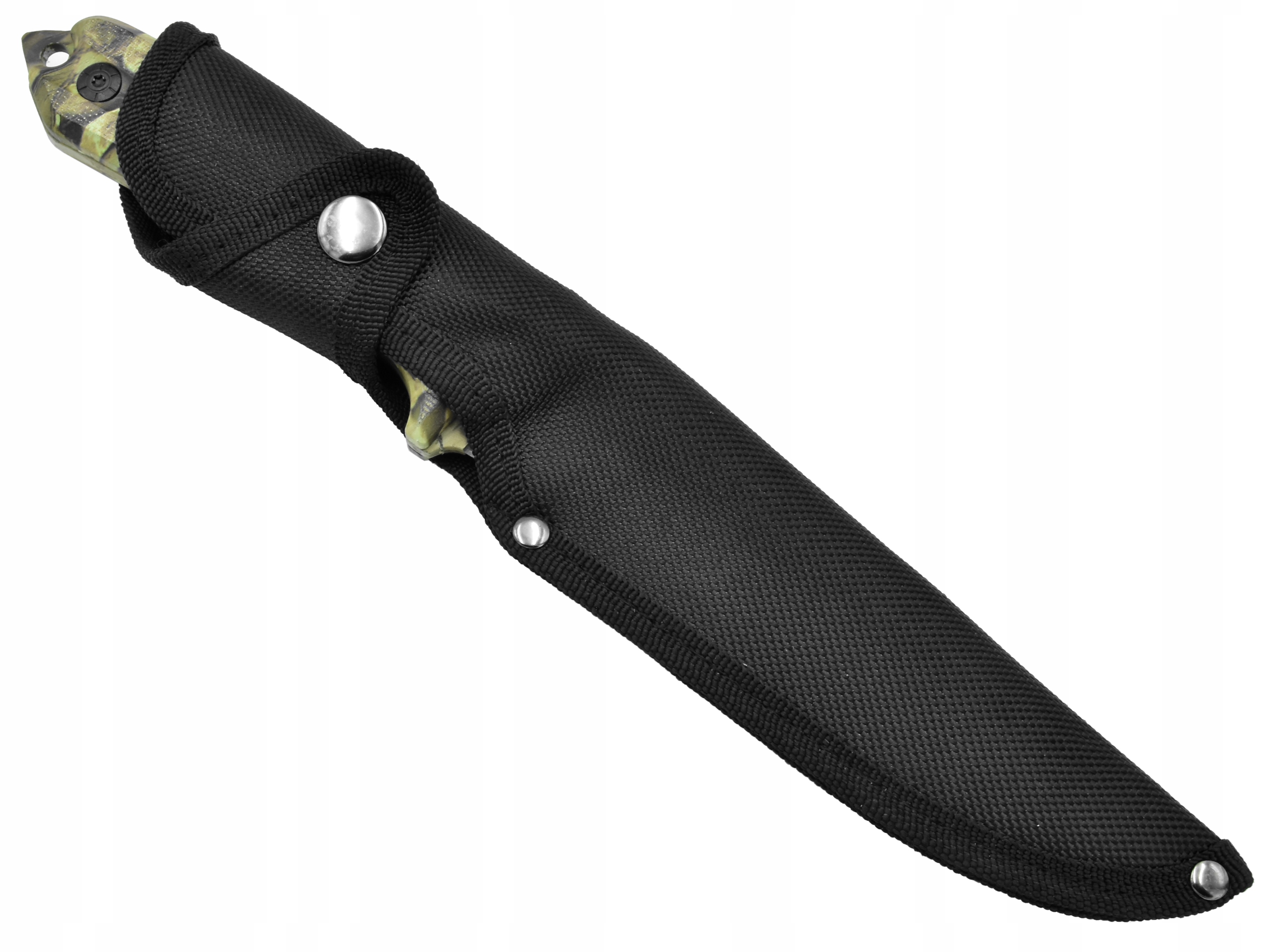 W komplecie z nożem oferowana jest czarna pochwa z cordury, zapinana metalowym zatrzaskiem.