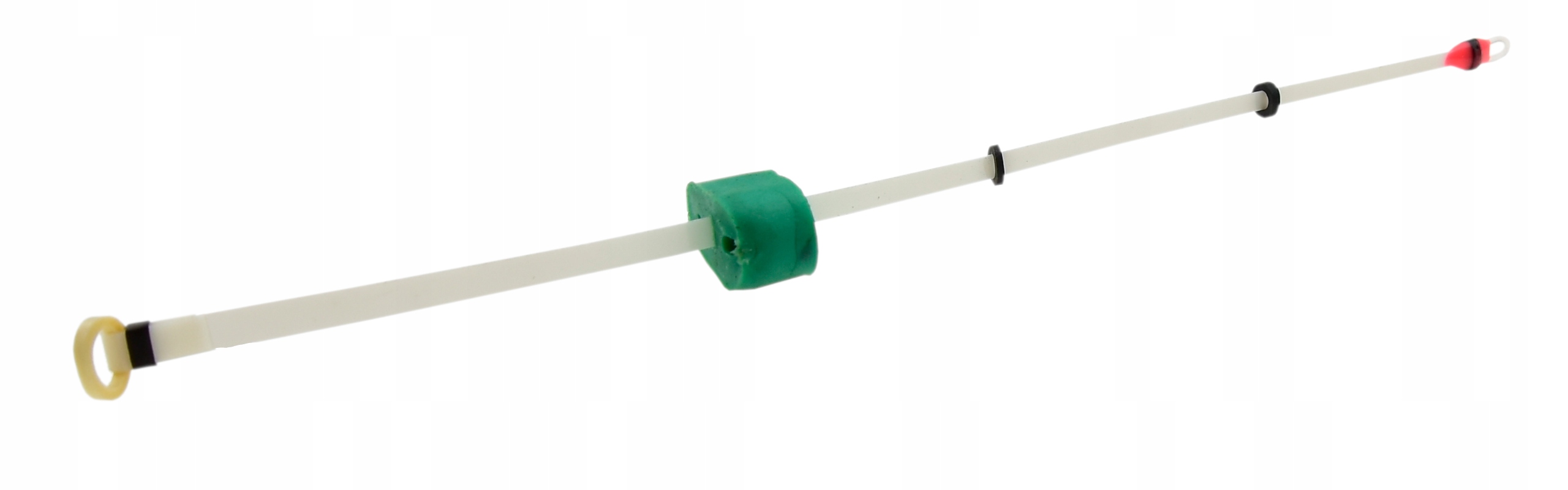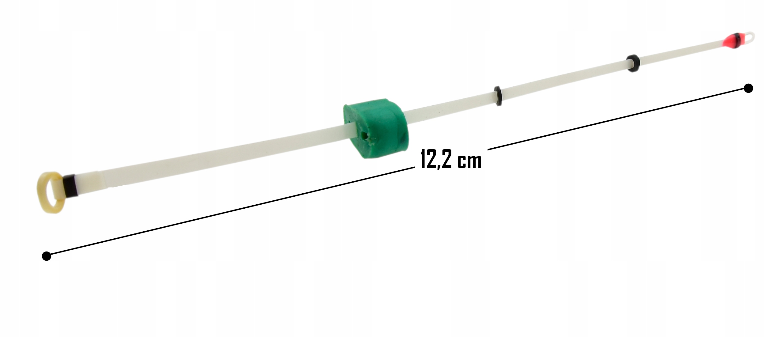Cechy produktu: • Materiał: trwały Lawsan – odporny na mróz i przypadkowe uderzenia. • Długość: 12,2 cm • Mocowanie: silikonowe uchwyty z dwoma przelotowymi otworami – pewnie trzymają wędkę i żyłkę. • Wykończenie: oczko na końcu – szybki i uniwersalny montaż. • Twardość: średnia – daje idealną równowagę między sprężystością a stabilnością. • Czułość: wysoka – reaguje na delikatne brania, a jednocześnie nie jest nadmiernie podatny na drgania przy większych rybach.