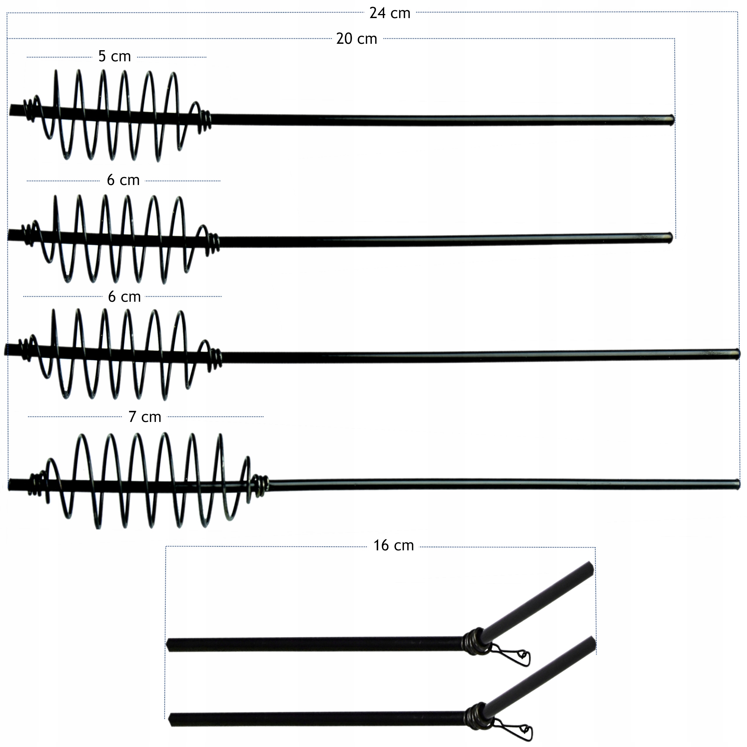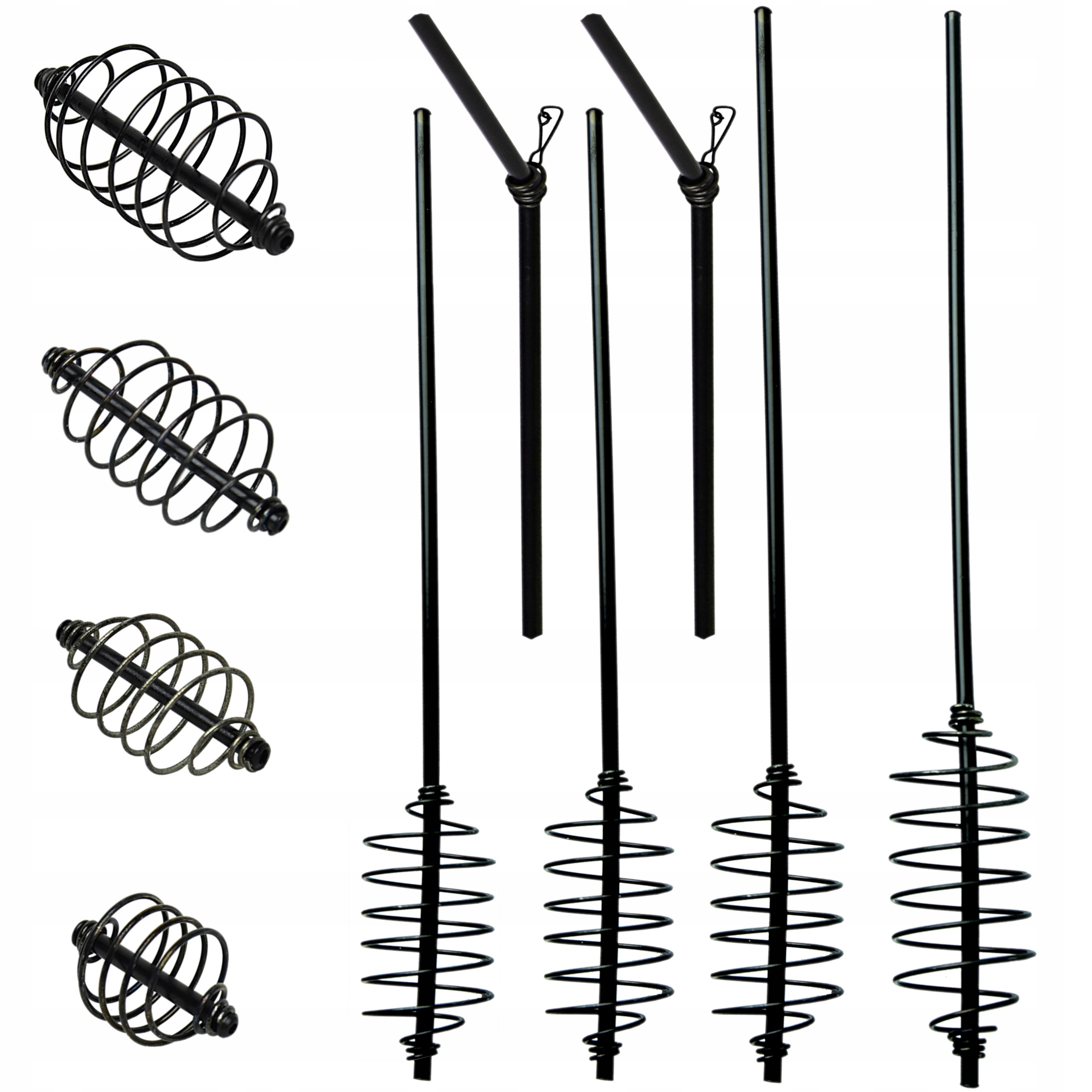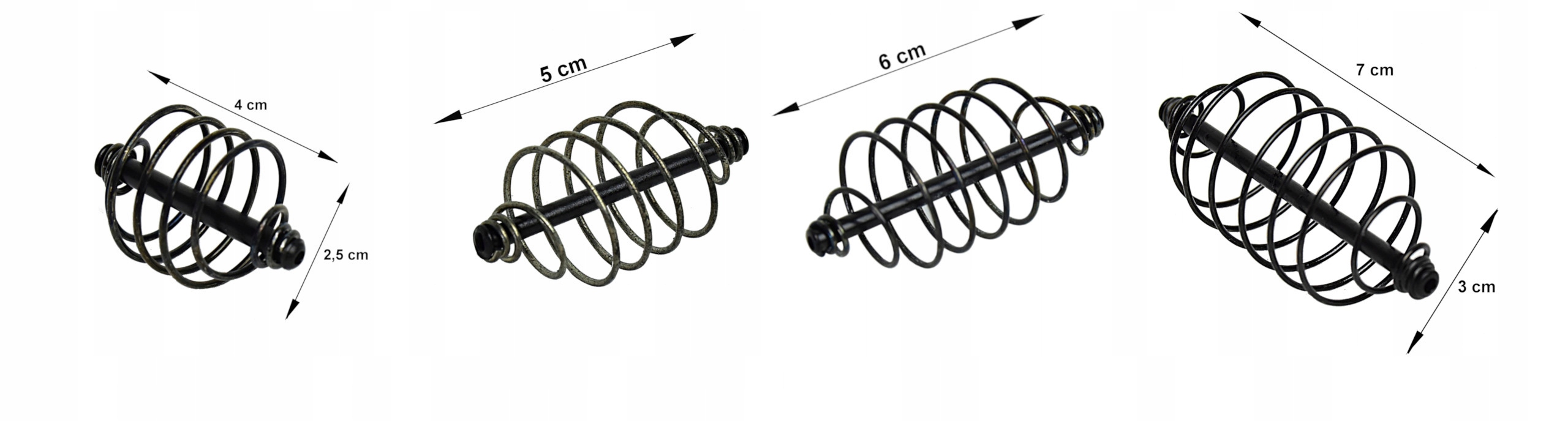 SPRĘŻYNY ZANĘTOWE niedociążone, każda z widocznych sprężyn zanętowych jest inna - różnią się rozmiarem co pozwala na dostosowanie zestawu do różnych warunków łowienia oraz wielkości porcji zanęty.