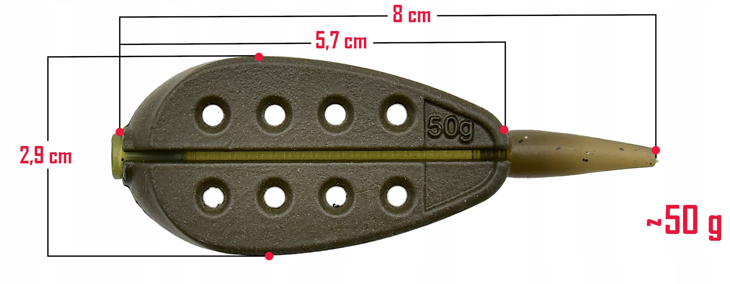 - Kompaktowy, aerodynamiczny kształt – dobrze leży na dnie, nie przemieszcza się po rzucie.