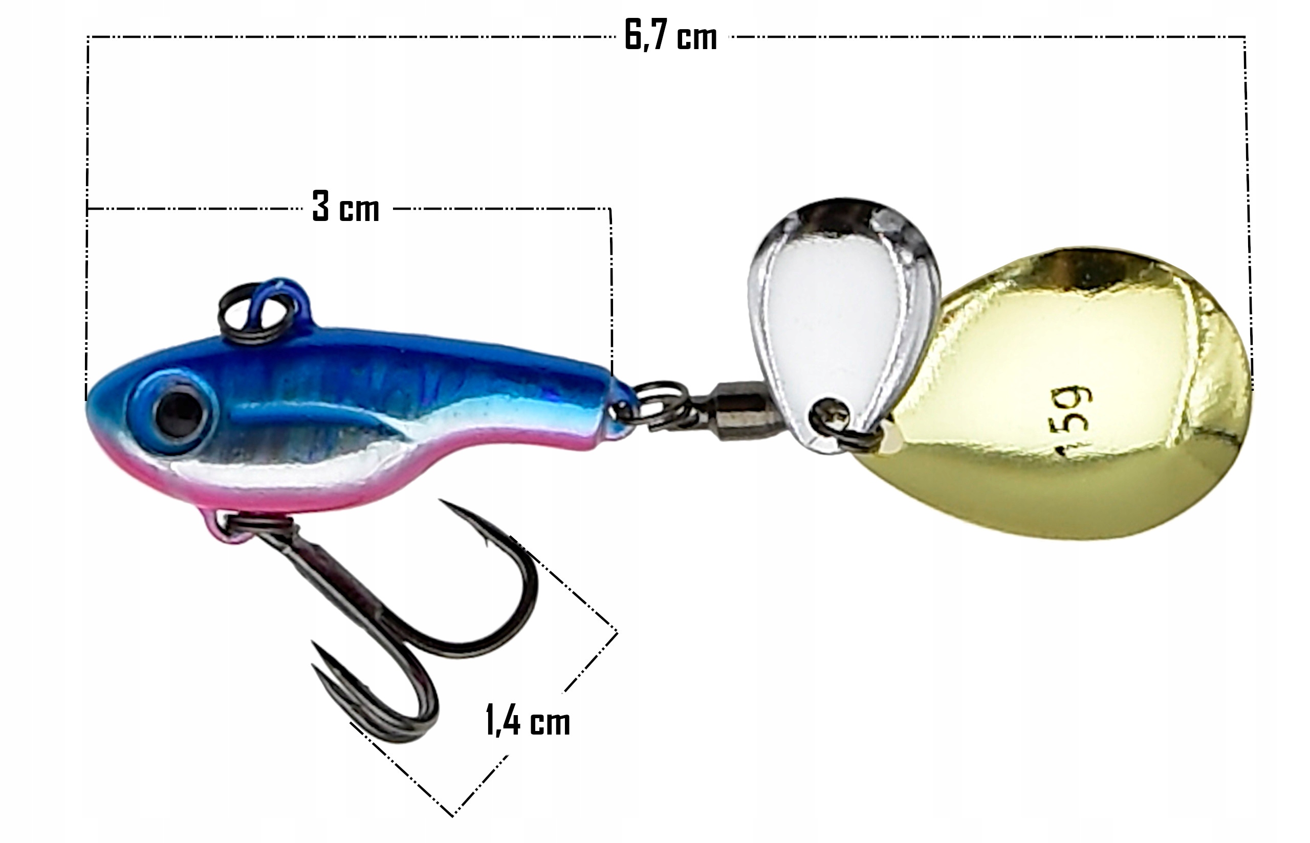 Dzięki realistycznemu designowi i 3D wykończeniu przypomina prawdziwą rybkę, co prowokuje drapieżniki do ataku. Wbudowana wirówka (łopatka obrotowa) generuje dodatkowe refleksy świetlne i wibracje w wodzie, zwiększając skuteczność połowu. Przynęta waży 15 g, co umożliwia dalekie rzuty i precyzyjne prowadzenie. Dzięki tonącej konstrukcji (sinking) można nią łowić na różnych głębokościach, dostosowując technikę prowadzenia do warunków i aktywności ryb.