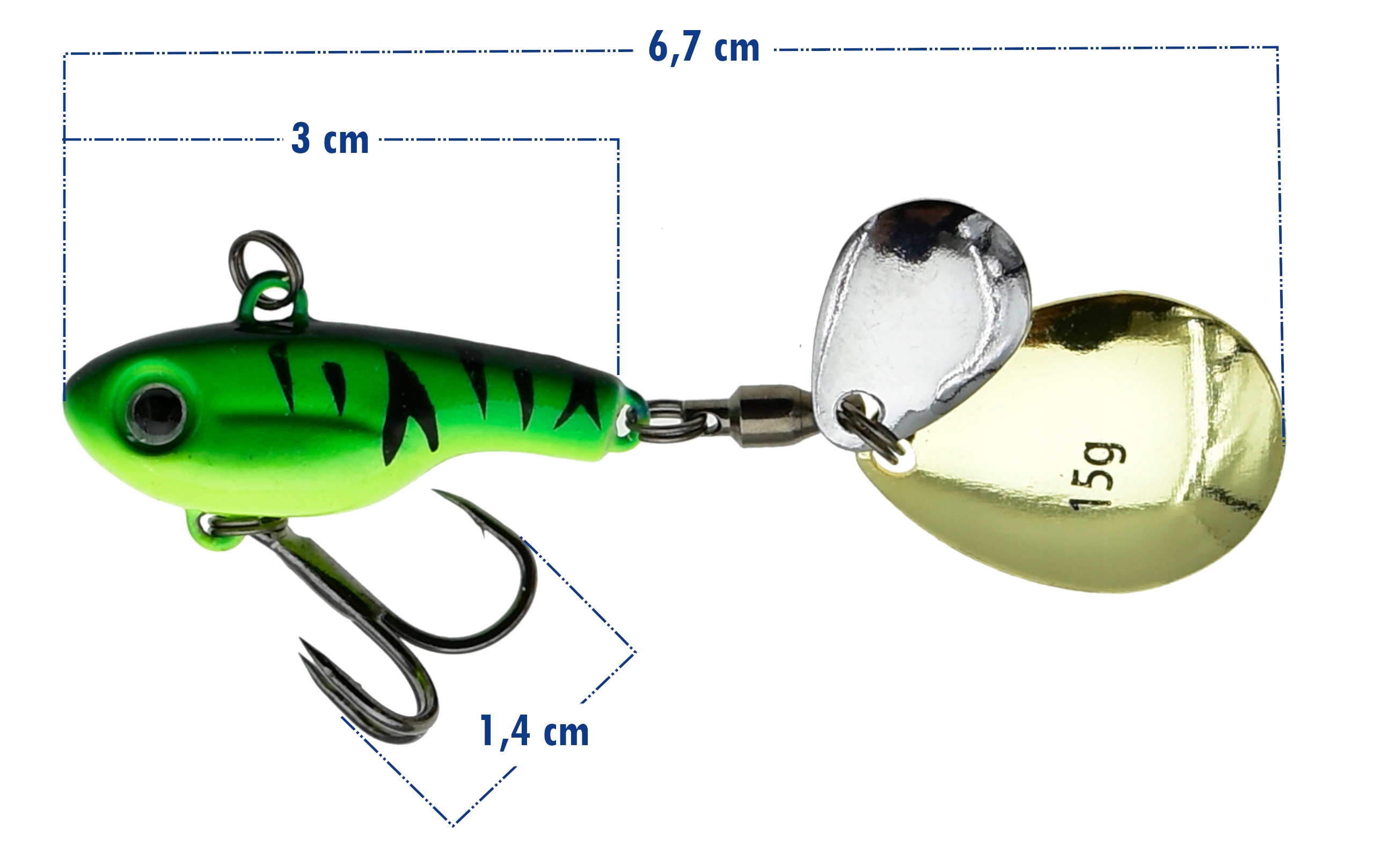 Dzięki realistycznemu designowi i 3D wykończeniu przypomina prawdziwą rybkę, co prowokuje drapieżniki do ataku. Wbudowana wirówka (łopatka obrotowa) generuje dodatkowe refleksy świetlne i wibracje w wodzie, zwiększając skuteczność połowu. Przynęta waży 15 g, co umożliwia dalekie rzuty i precyzyjne prowadzenie. Dzięki tonącej konstrukcji (sinking) można nią łowić na różnych głębokościach, dostosowując technikę prowadzenia do warunków i aktywności ryb.