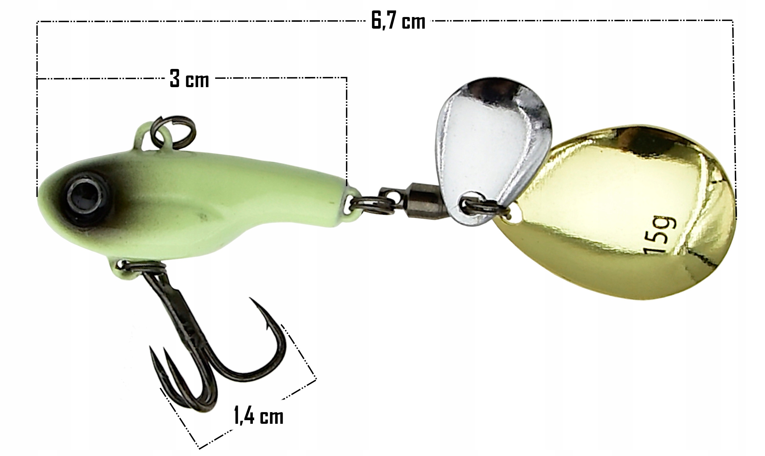 Dzięki realistycznemu designowi i 3D wykończeniu przypomina prawdziwą rybkę, co prowokuje drapieżniki do ataku. Wbudowana wirówka (łopatka obrotowa) generuje dodatkowe refleksy świetlne i wibracje w wodzie, zwiększając skuteczność połowu. Przynęta waży 15 g, co umożliwia dalekie rzuty i precyzyjne prowadzenie. Dzięki tonącej konstrukcji (sinking) można nią łowić na różnych głębokościach, dostosowując technikę prowadzenia do warunków i aktywności ryb.