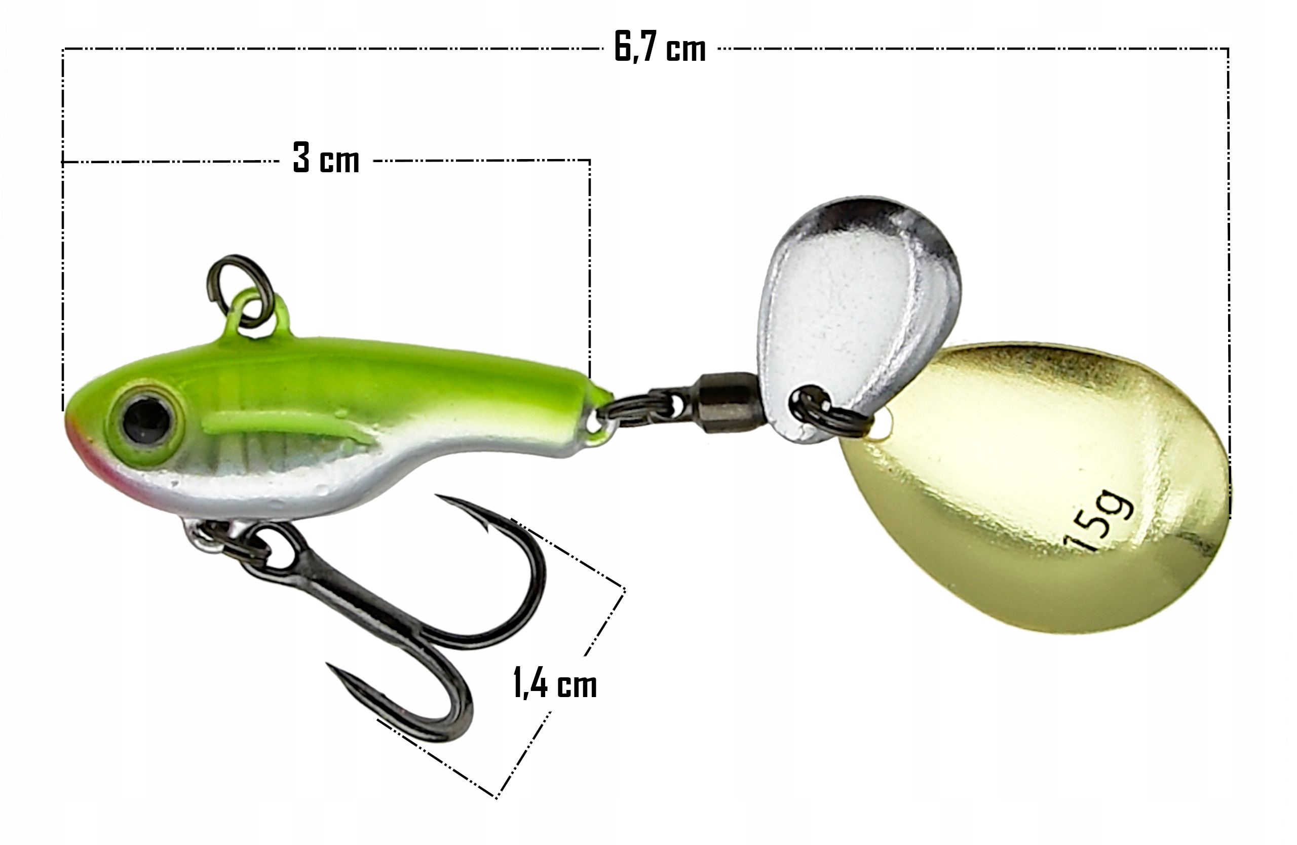 Dzięki realistycznemu designowi i 3D wykończeniu przypomina prawdziwą rybkę, co prowokuje drapieżniki do ataku. Wbudowana wirówka (łopatka obrotowa) generuje dodatkowe refleksy świetlne i wibracje w wodzie, zwiększając skuteczność połowu. Przynęta waży 15 g, co umożliwia dalekie rzuty i precyzyjne prowadzenie. Dzięki tonącej konstrukcji (sinking) można nią łowić na różnych głębokościach, dostosowując technikę prowadzenia do warunków i aktywności ryb.