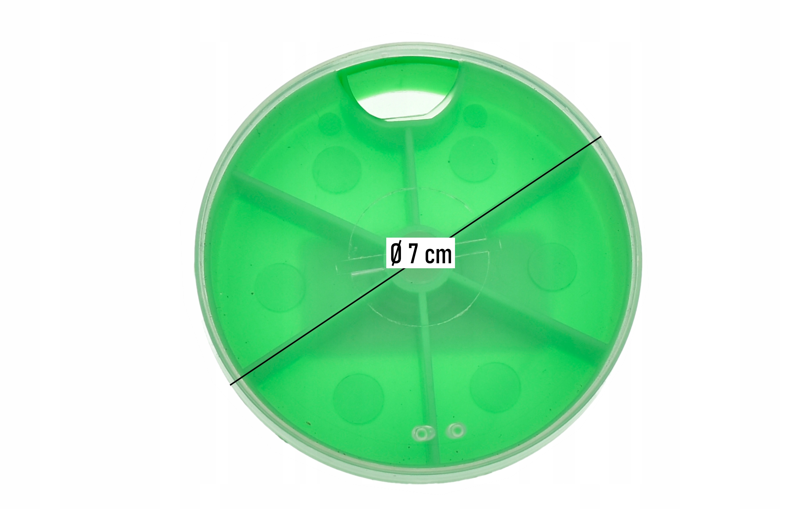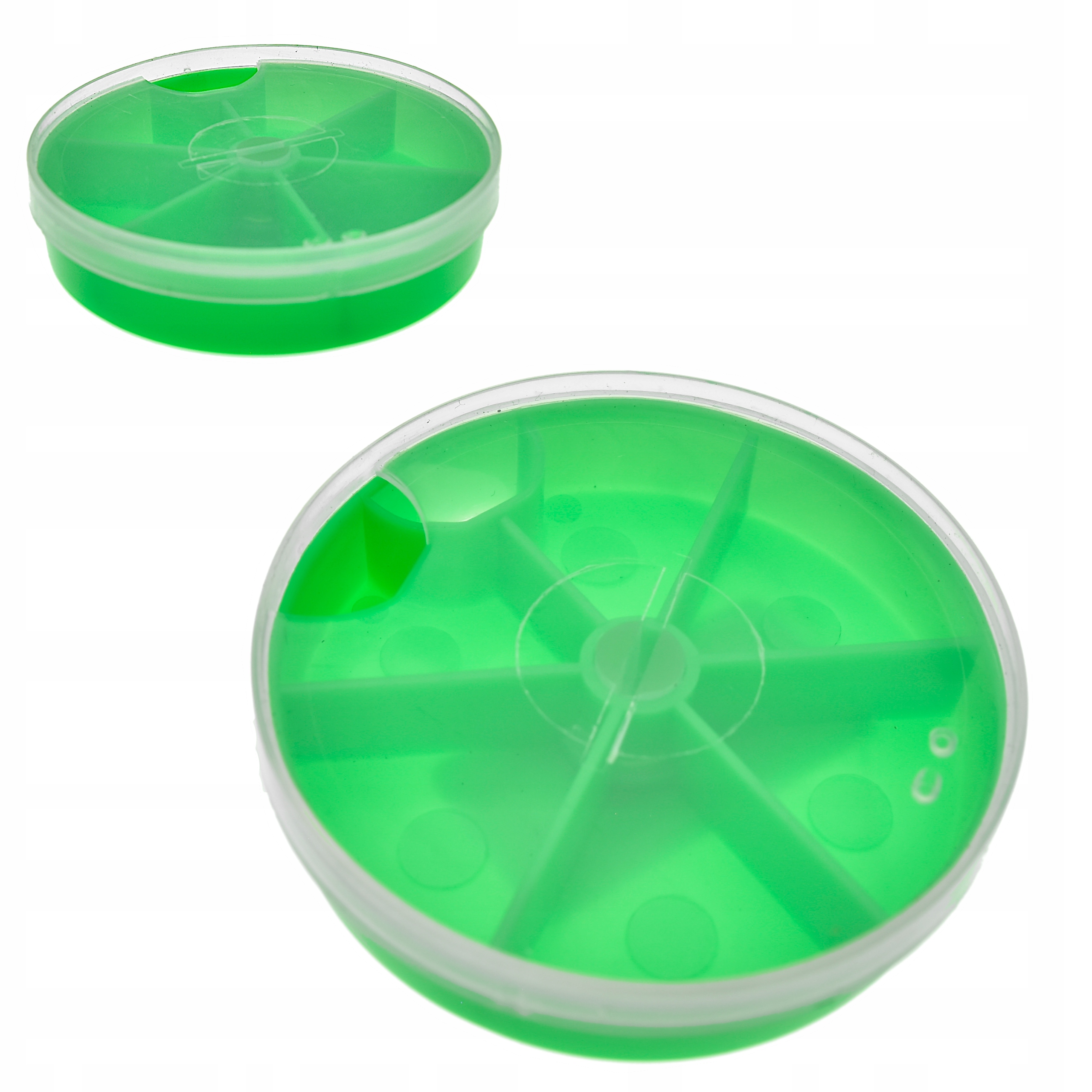 Bardzo wytrzymały 6 - komorowy okrągły przybornik wykonany z tworzywa.