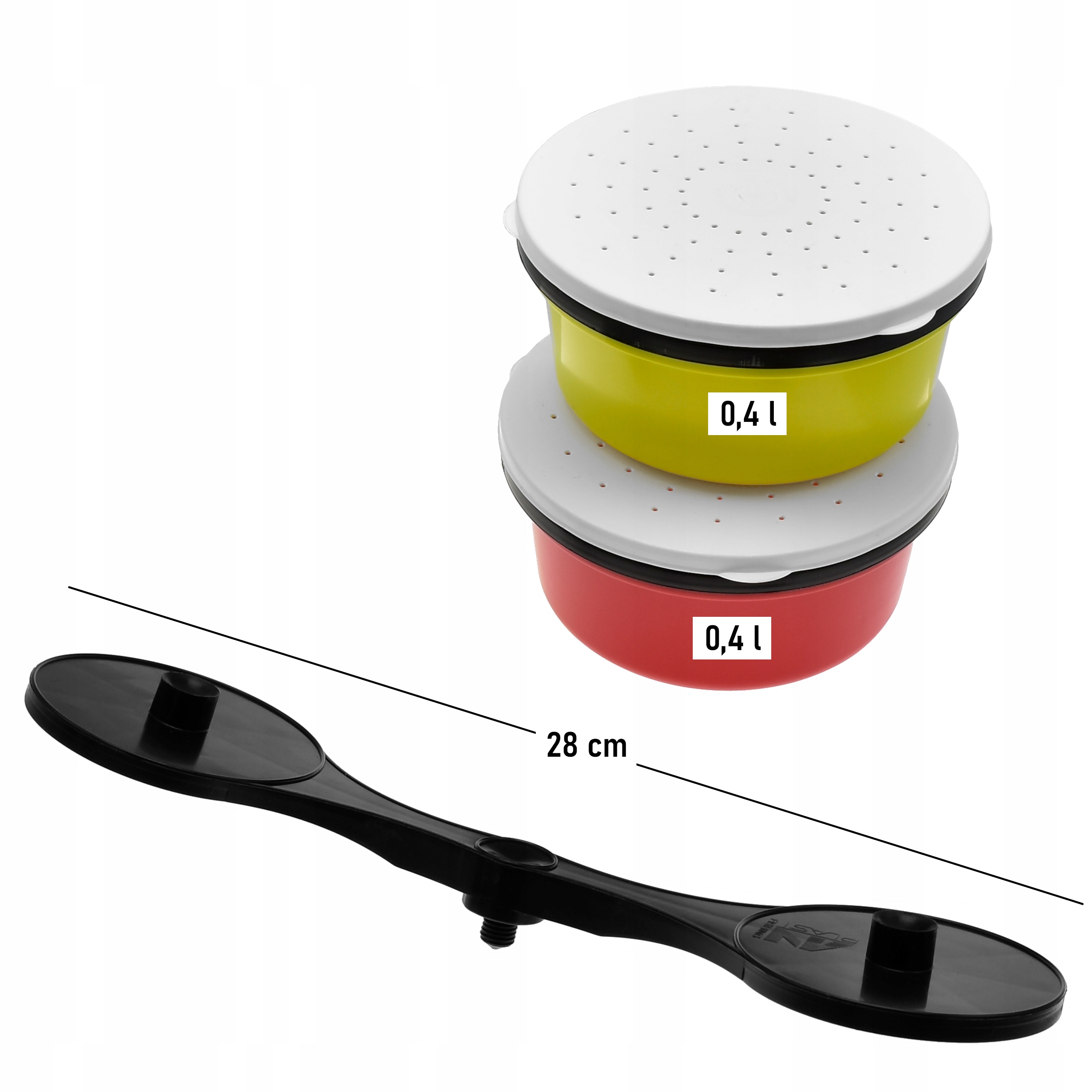 Pojemniki posiadają perforowane pokrywki zapewniające dostęp tlenu dla żywej przynęty.