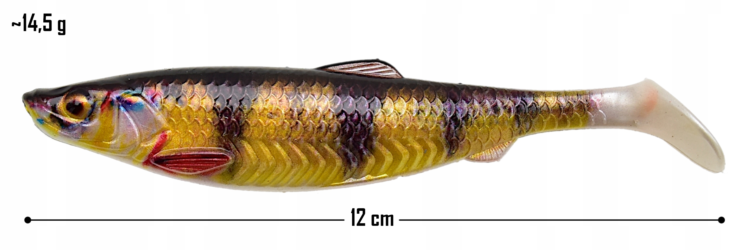 Realistyczna gumowa przynęta wędkarska, wzorowana na kształcie i kolorystyce prawdziwej ryby, zaprojektowana z myślą o skutecznym łowieniu drapieżników. Dzięki naturalnym ruchom w wodzie oraz wyrazistym barwom, idealnie imituje prawdziwą zdobycz, co skutecznie prowokuje drapieżniki do ataku.
