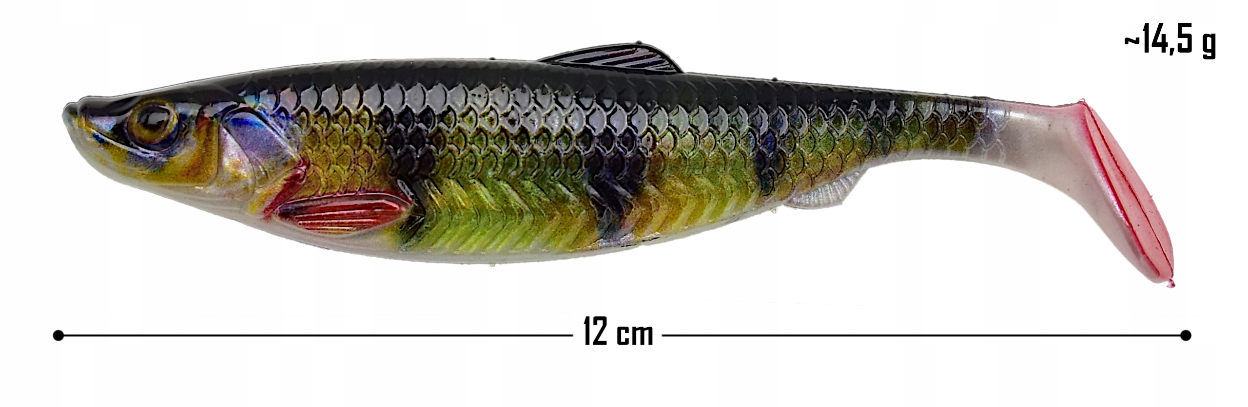 Realistyczna gumowa przynęta wędkarska, wzorowana na kształcie i kolorystyce prawdziwej ryby, zaprojektowana z myślą o skutecznym łowieniu drapieżników. Dzięki naturalnym ruchom w wodzie oraz wyrazistym barwom, idealnie imituje prawdziwą zdobycz, co skutecznie prowokuje drapieżniki do ataku.