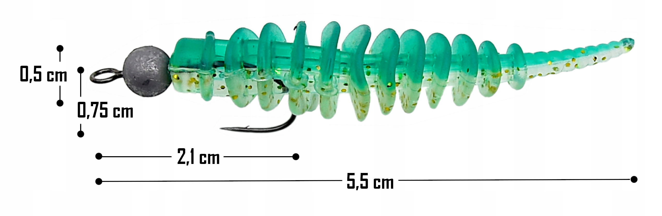 - Rodzaj przynęty: larwa/twister z segmentowanym korpusem
