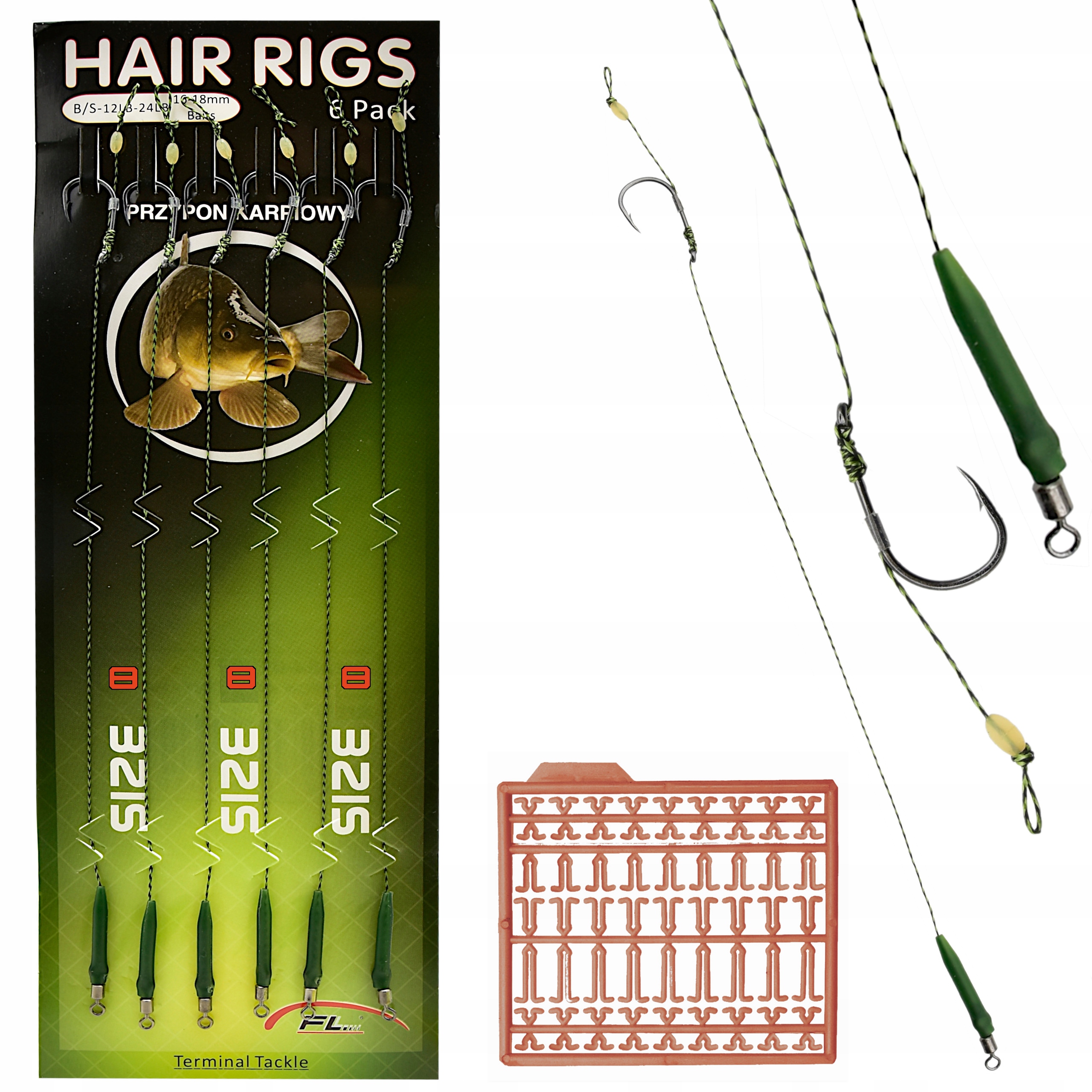 Przypony karpiowe z włosem 6 szt Hair Rigs Krętlik Hak #8 Stopery