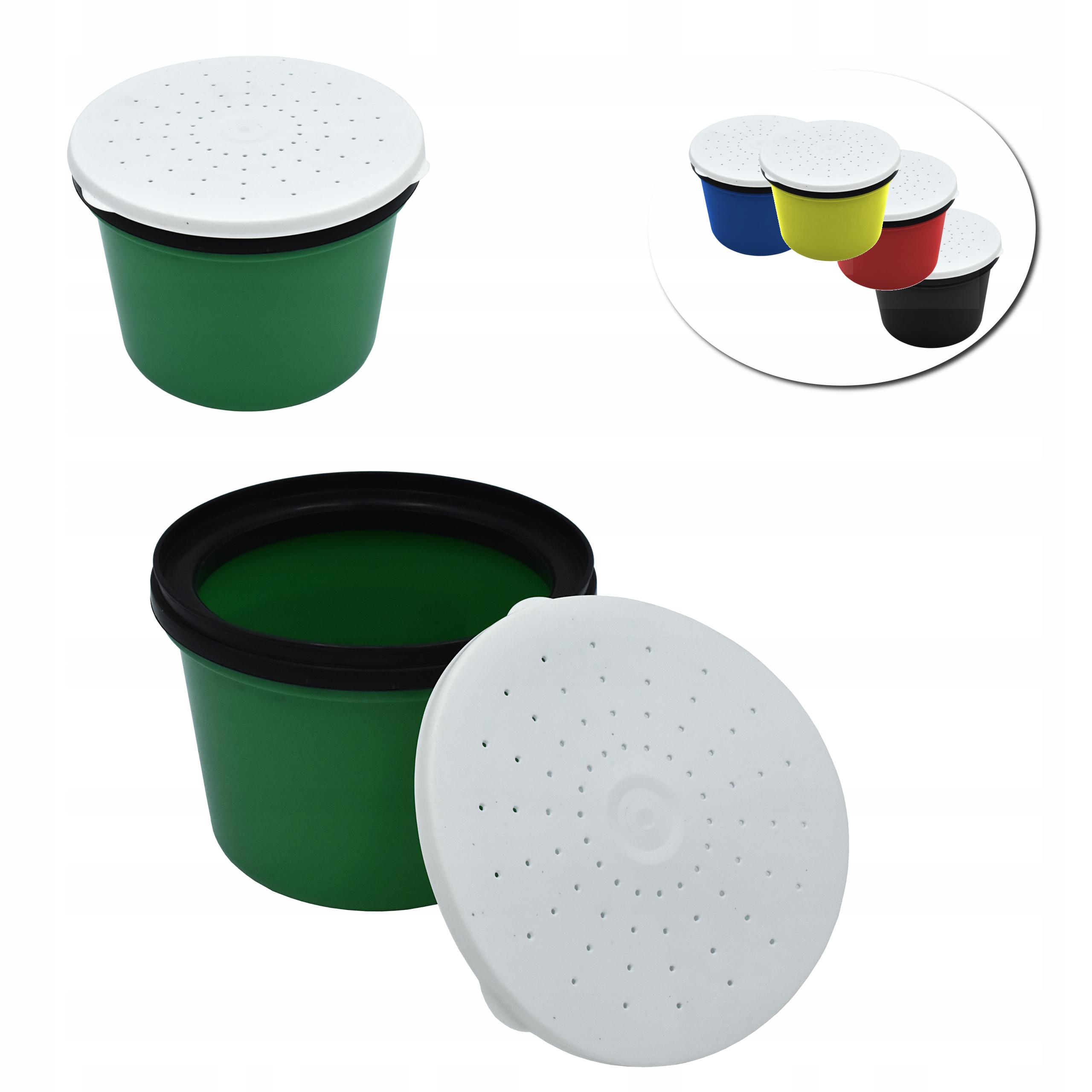 Pojemnik posiada perforowaną pokrywkę zapewniającą dostęp tlenu dla żywej przynęty.