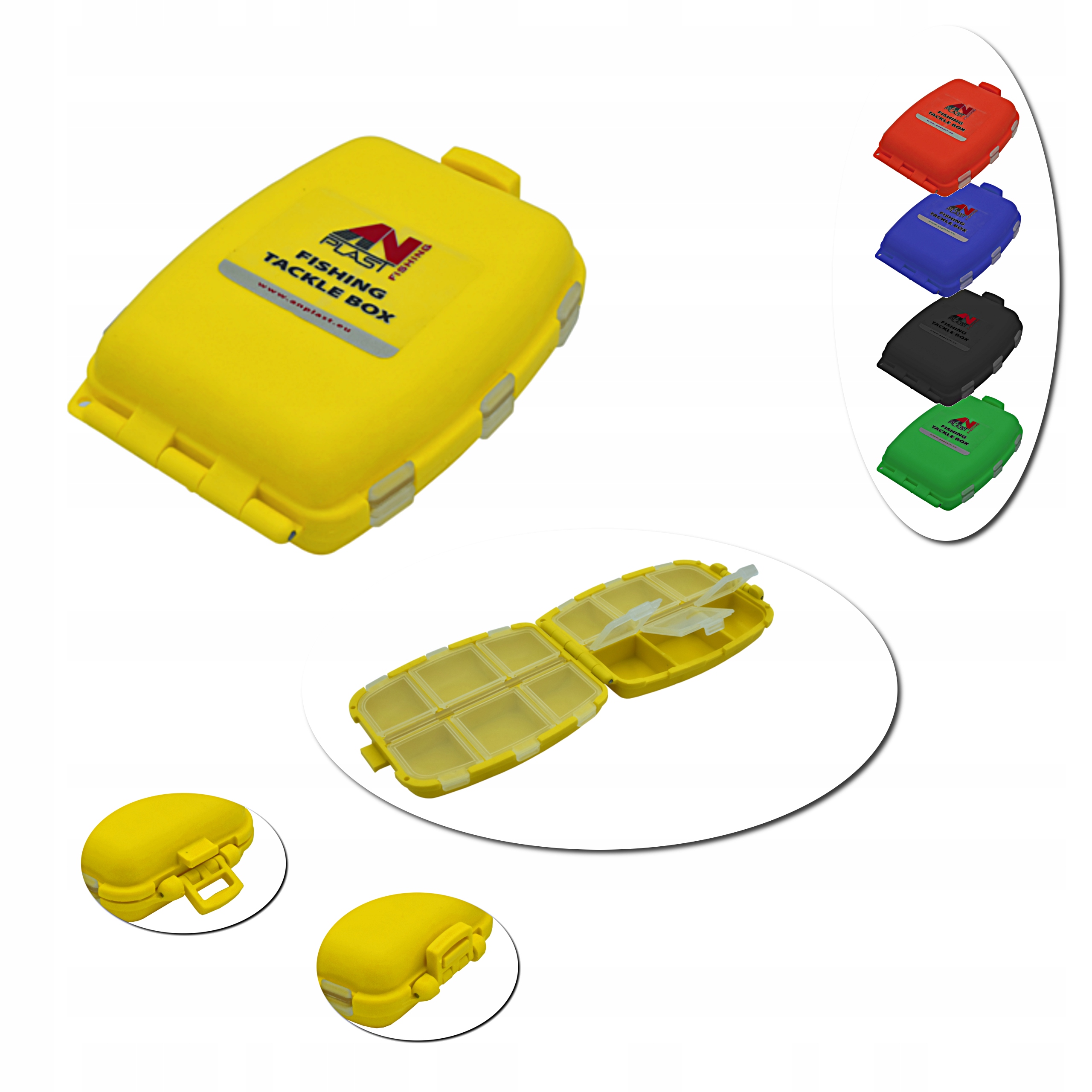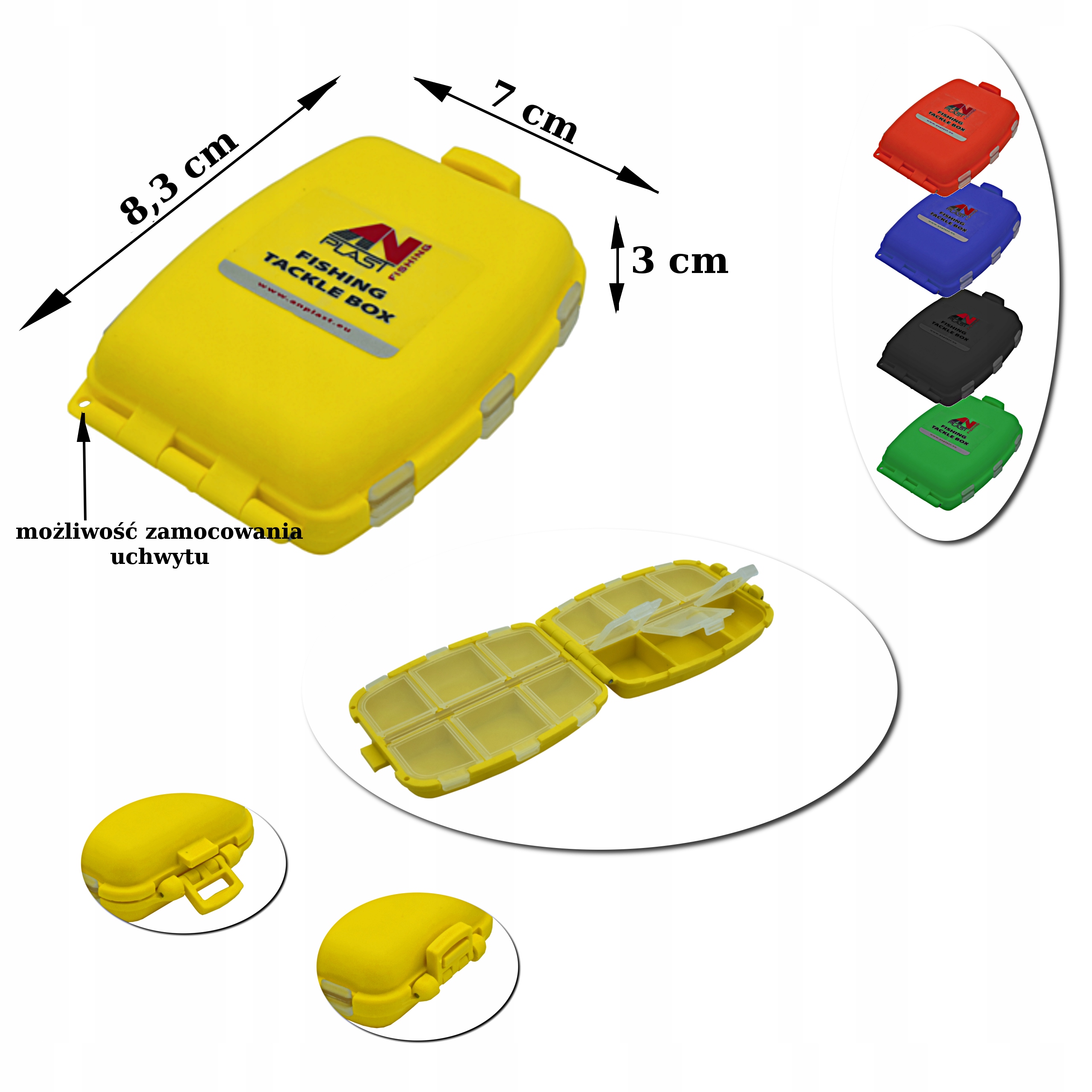 Bardzo wytrzymały 12-komorowy przybornik wykonany jest z tworzywa, które nie wchodzi w reakcję z twisterami, jego konstrukcja oraz dobór materiału sprawiają, że przybornik zawsze utrzymuje się na wodzie. Oś zawiasu jest wykonana z mosiądzu, co zapobiega korozji. Otwór w korpusie umożliwia zamocowanie uchwytu.