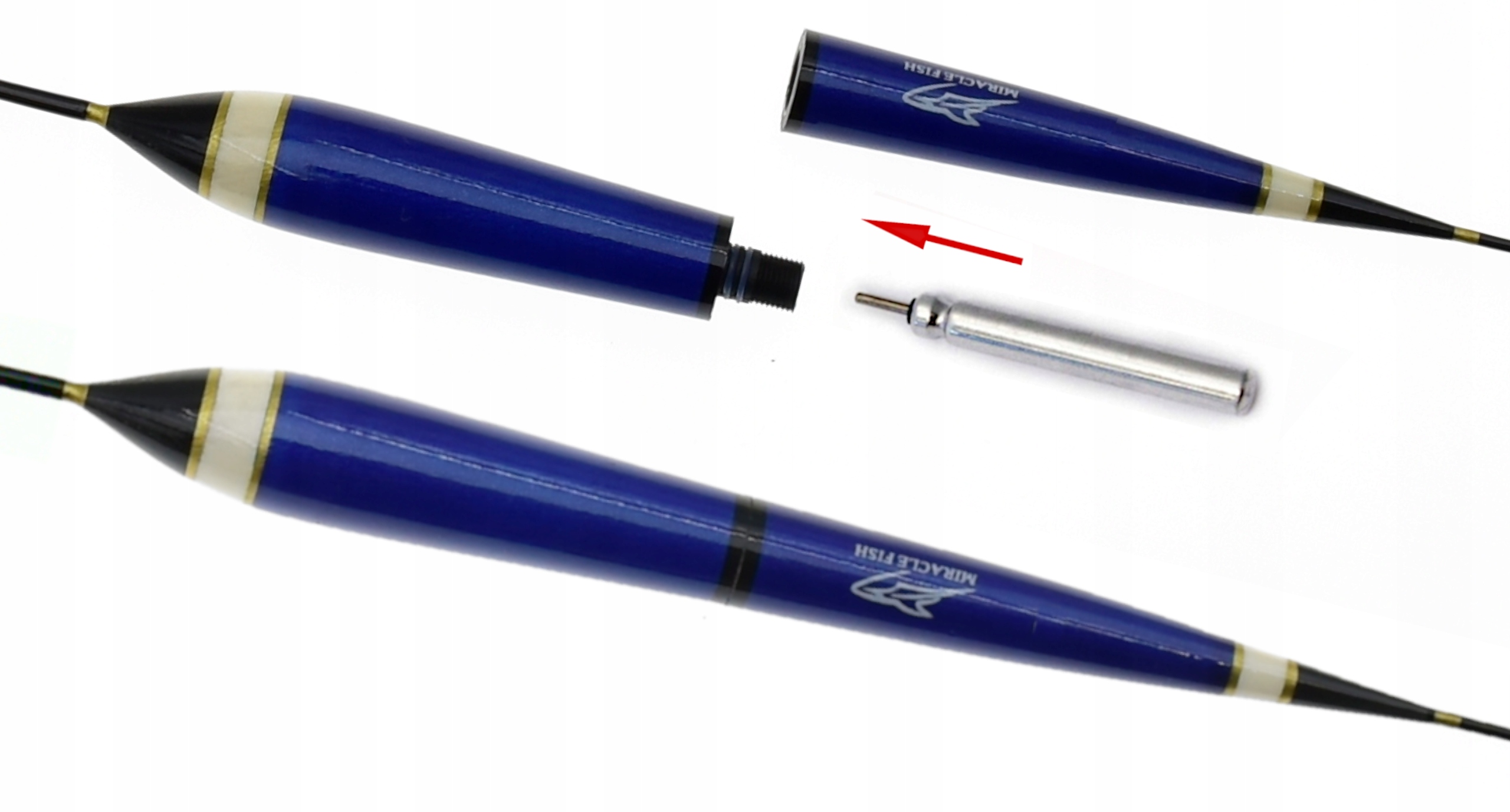 - wsuń baterię szpilką w stronę antenki, w górną część spławika i dociśnij aż zaświeci