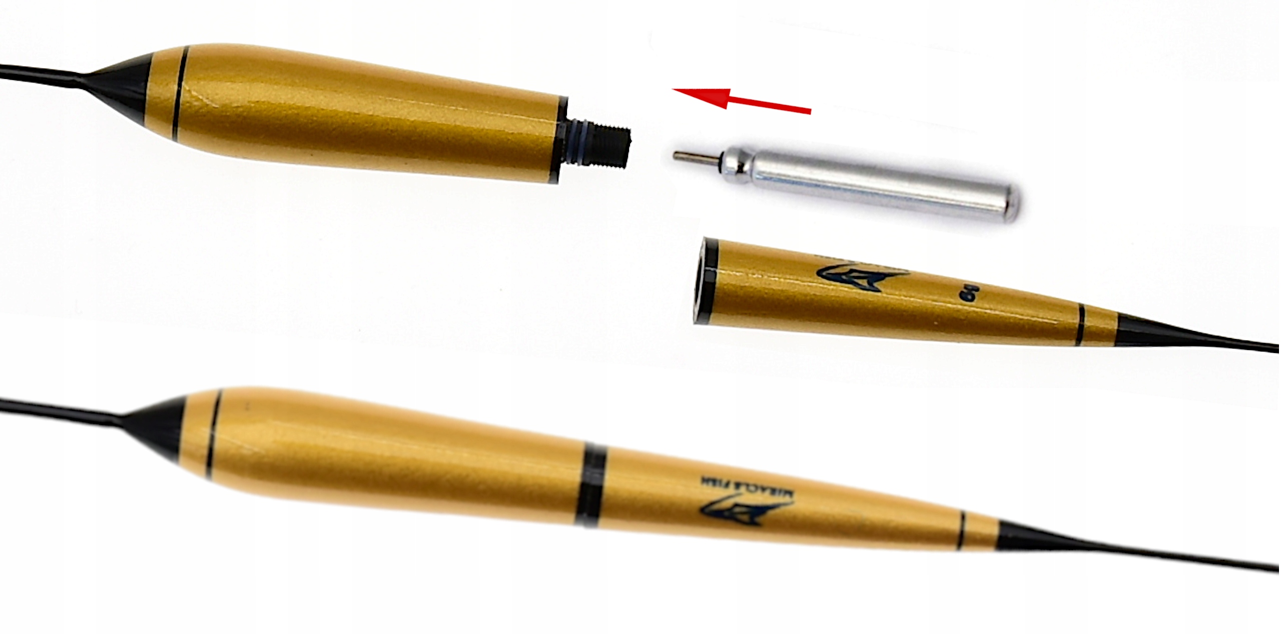 - wsuń baterię szpilką w stronę antenki, w górną część spławika i dociśnij aż zaświeci