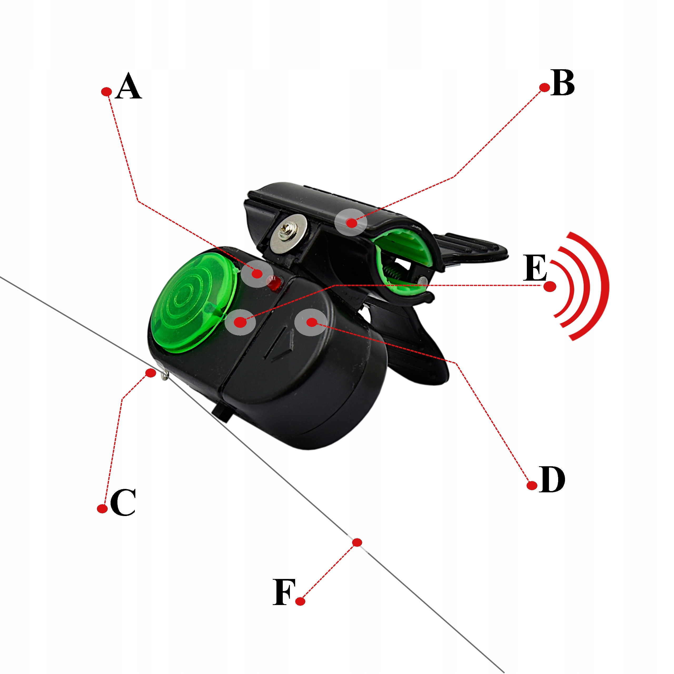 B - Klips za pomocą którego montujemy sygnalizator na wędzisku ( wew. strona silikonowa w celu ochrony wędki przed zadrapaniem)