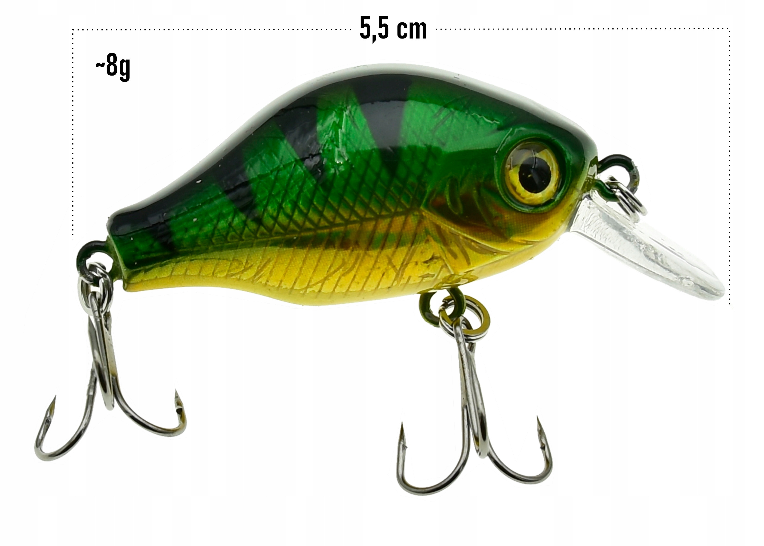 Dzięki trójwymiarowym oczom, wobler nabiera bardzo realistycznych cech. Wobler uzbrojony jest w dwie kotwice, co zwiększa efektywność podczas łowienia.