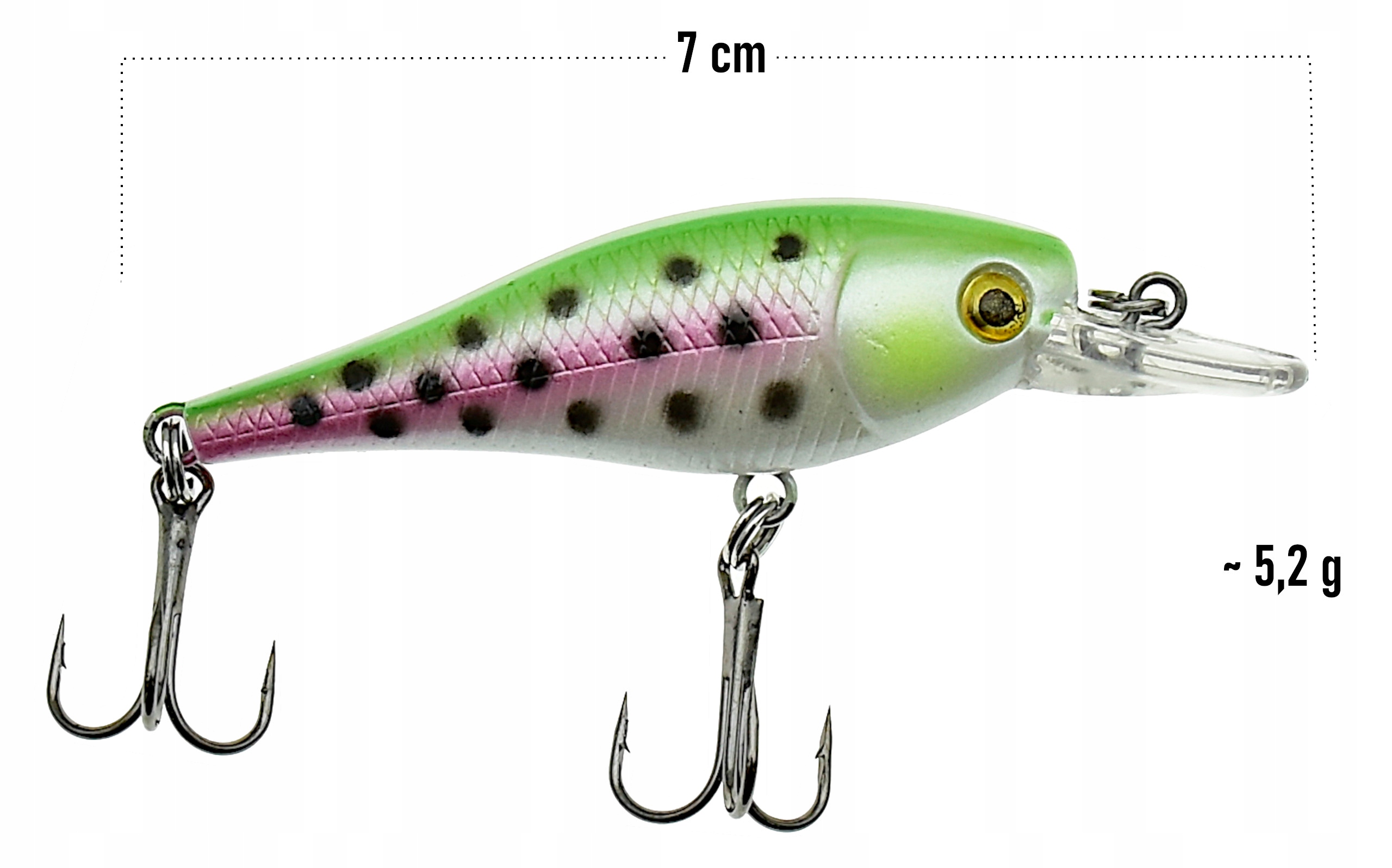 Dzięki trójwymiarowym oczom, wobler nabiera bardzo realistycznych cech. Wobler uzbrojony jest w dwie kotwice, co zwiększa efektywność podczas łowienia.