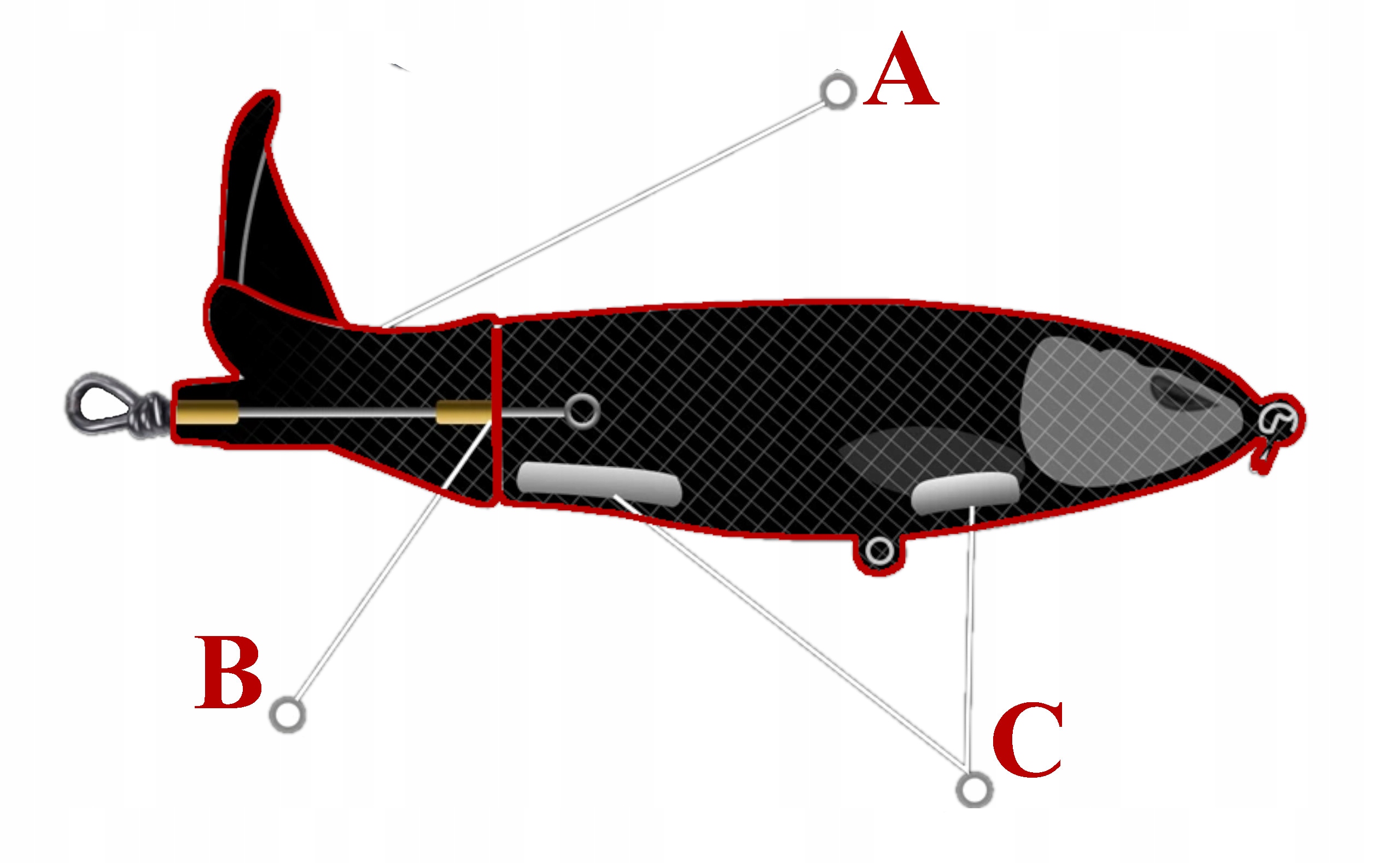 C. Odcinki brzucha to półstała konstrukcja wypełniona ołowianym ciężarkiem. Kontroluje środek ciężkości przynęty i wydaje dźwięk o niskiej częstotliwości.