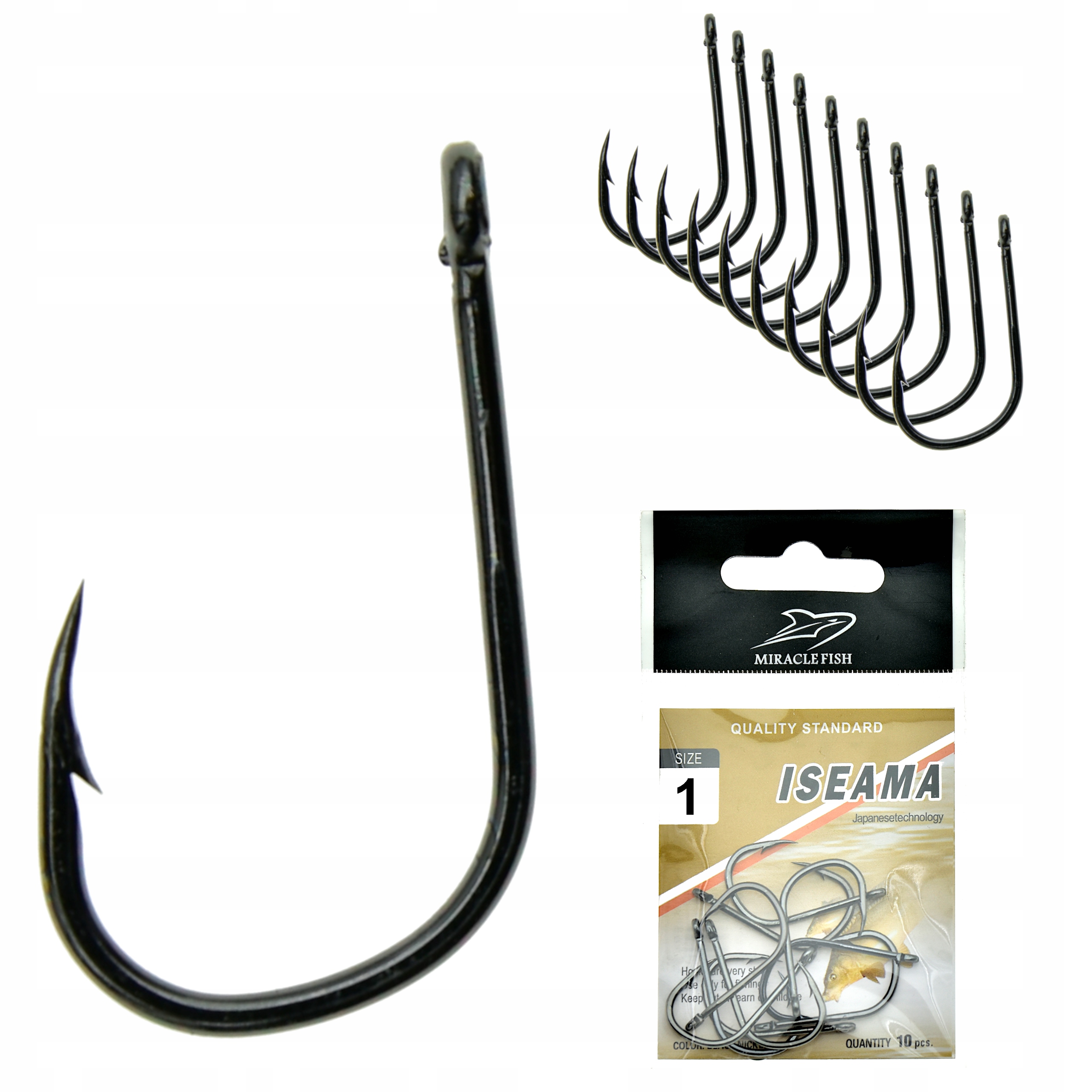 ISEAMA- Profesjonalna seria bardzo mocnych i ostrych haczyków zakończonych uszkiem w szerokiej gamie rozmiarów - (inne rozmiary dostępne na pozostałych aukcjach). Łowny haczyk z szerokim kolankiem o uniwersalnym przeznaczeniu zarówno do łowienia na przynęty zwierzęce a także na kukurydzę, ciasto, pęczak oraz ziemniaki. Większe rozmiary sprawdzają się do łowienia Karpi.